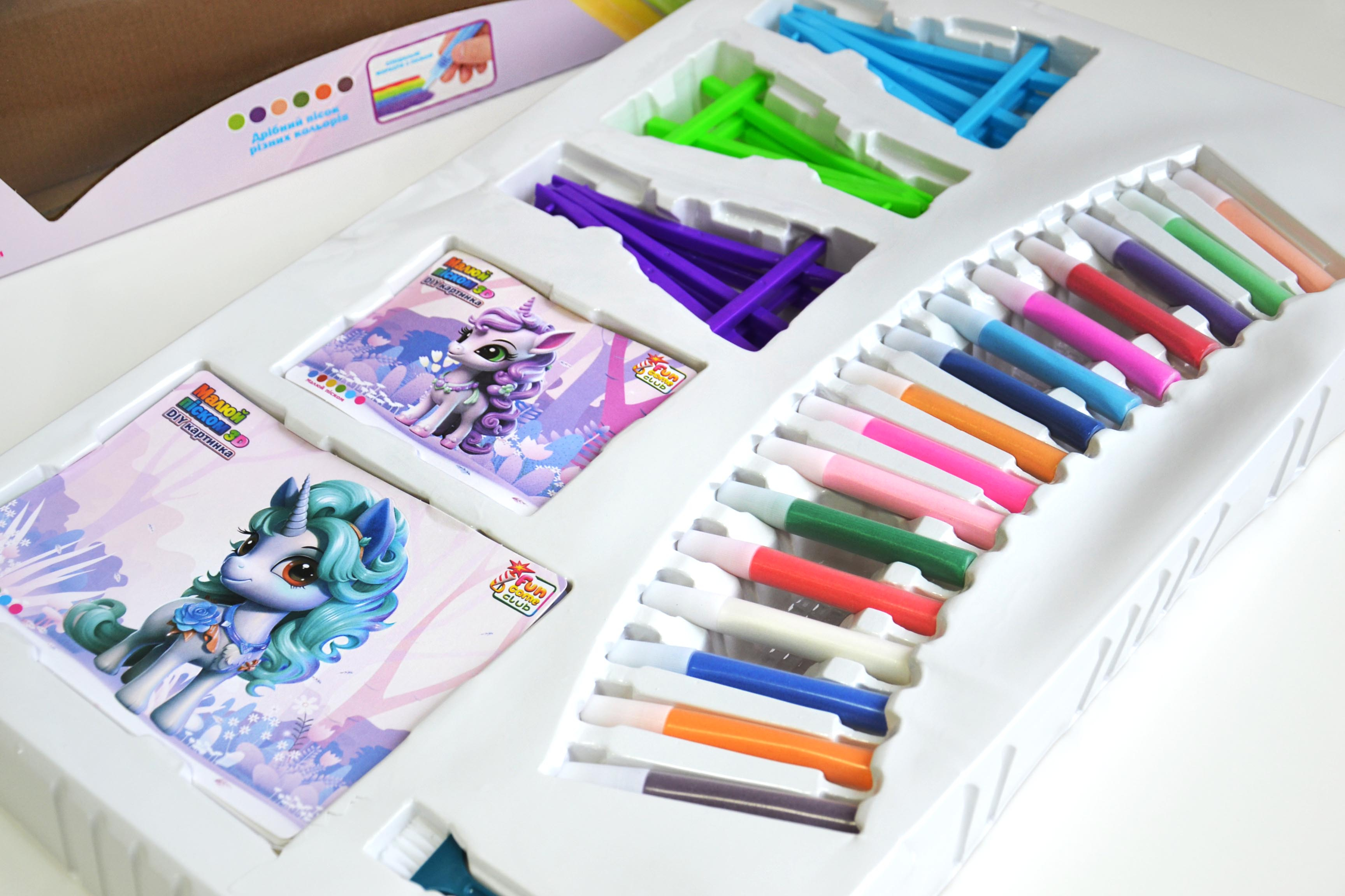 Замість звичних олівців чи фарб діти зможуть використовувати кольоровий пісок, щоб наповнити свої малюнки яскравими відтінками.