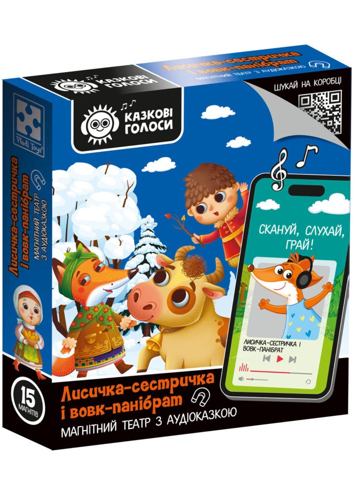 Це комбо 2 в 1: театр і казка у коробці! Просто відкрийте упаковку і на зворотній її частині знайдете QR-код. Відскануйте його за допомогою гаджета, і ви потрапите до аудіоказки “Лисичка-сестричка і вовк-панібрат”. Включайте казку і слухайте разом з малюком або грайте з магнітами під час прослуховування.