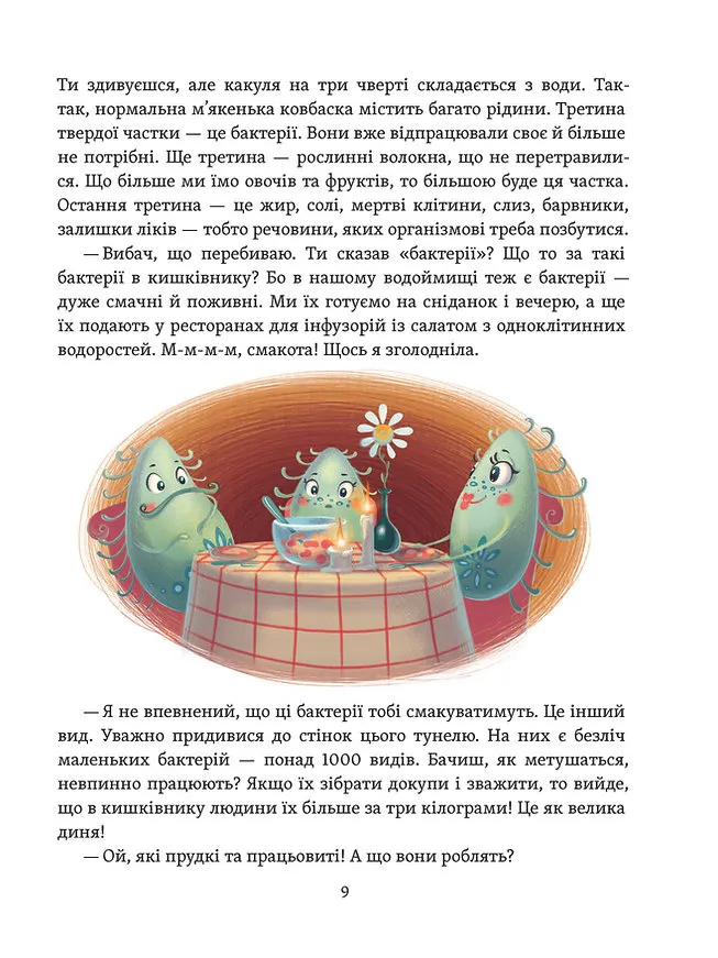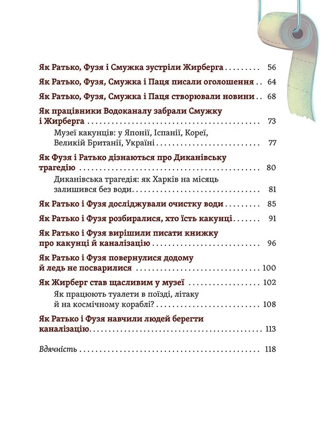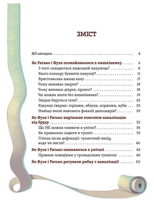 Авторка ненав’язливо і з гумором знайомить дітей з процесами роботи організму, зокрема з тим, що відбувається після візиту до вбиральні. Юлія Ярмоленко майстерно пояснює складні речі простою мовою. У книзі порушуються такі теми: