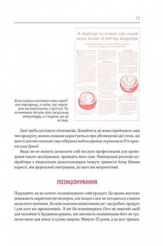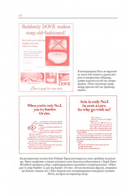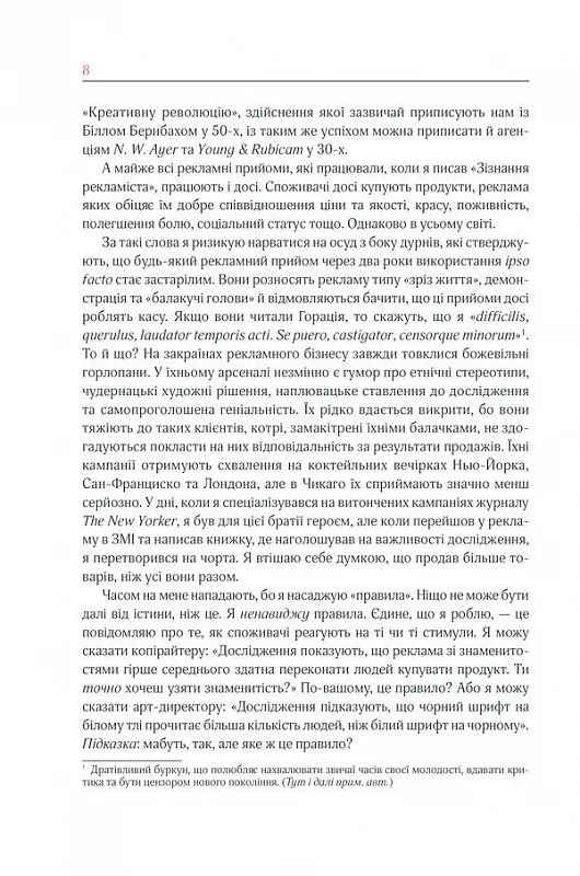 - Як зробити рекламу, яка продаватиме?- Якими мають бути тексти, ілюстрації, дизайн?- Як залучити та утримати клієнта?- Як управляти рекламним агентством?У цій книзі численні історії реальних проєктів, блискучих ідей, а іноді й невдалих рішень. Оґілві описує всю «внутрішню кухню» світу реклами та розповідає численні байки, які дозволяють поринути у світ рекламного бізнесу минулого століття.Фішки книги:• У книзі понад 150 кольорових та чорно-білих ілюстрацій —класичні приклади друкованої реклами та розкадрування телевізійних роликів. Теорія та практика реклами в картинках!• А ще не забувайте про те, що ця книга написана одним із найкращих копірайтерів світу — вона читається легко та неймовірно цікаво.Книга обов’язкова до прочитання всім, хто пов’язаний з рекламою: копірайтерам, дизайнерам, менеджерам проєктів — особливо фахівцям-початківцям.Основам потрібно вчитися у майстра.