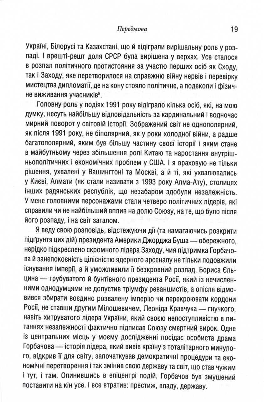 Остання імперія руйнує популярний міф про те, що розпад СРСР зрежисували Сполучені Штати. Плохій показує, що західні лідери, навпаки, боялися неконтрольованого колапсу, адже це могло спричинити хаос у Євразії. Ключову роль у драмі розпаду відіграла саме Україна — її прагнення до незалежності слугувало прикладом для інших радянських республік, зокрема Білорусі та Казахстану.