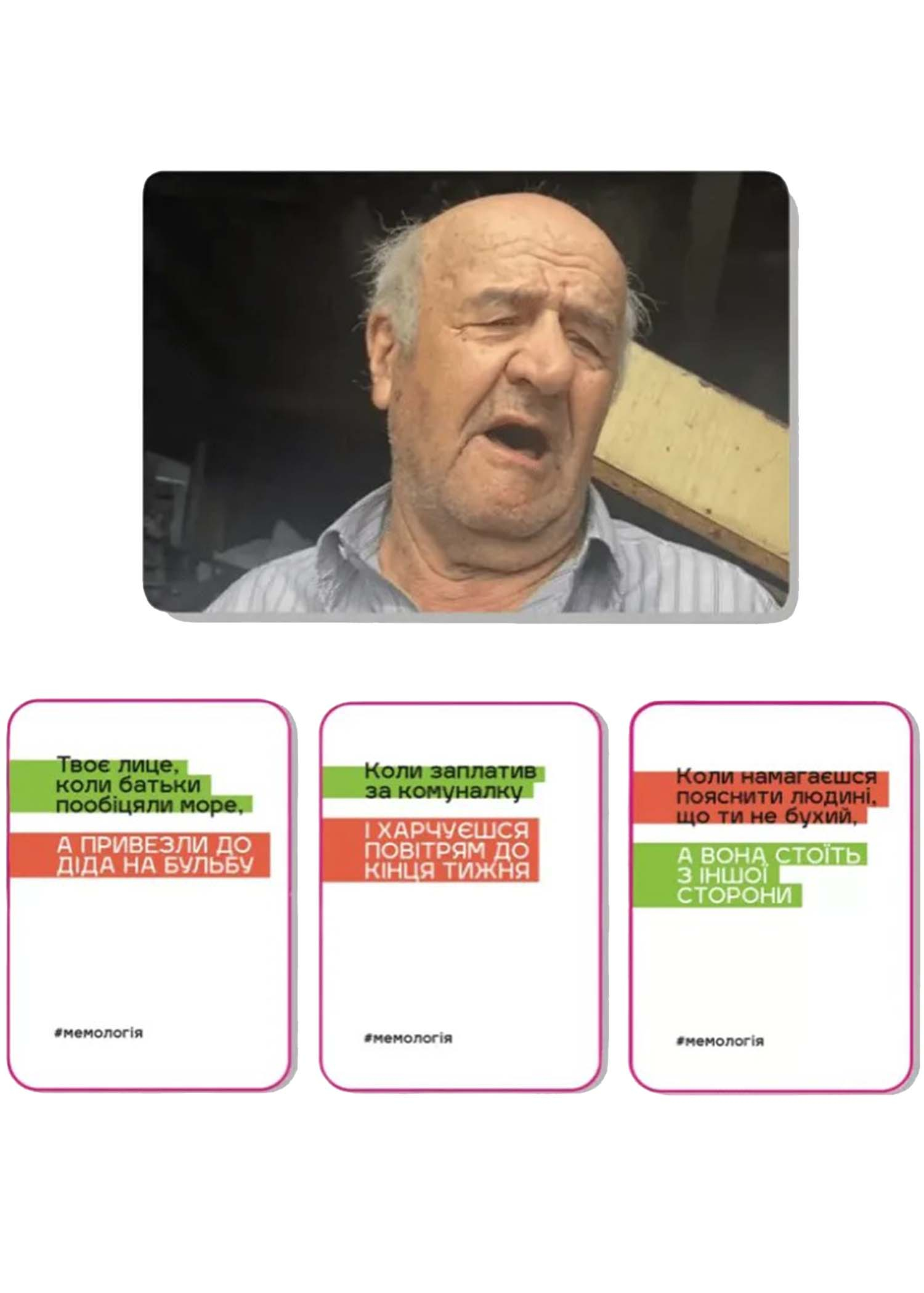 Гра “Мемологія” – це захоплююча настільна гра, в якій гравці повинні поєднувати картки мемів та текстові картки. На Вас чекає:– 126 улюблених мемів;– 180 текстових карток-жартів;– мольберт підставка;
