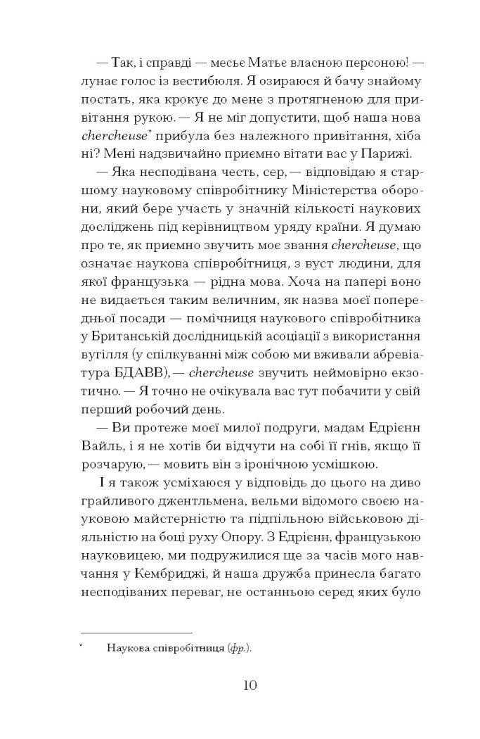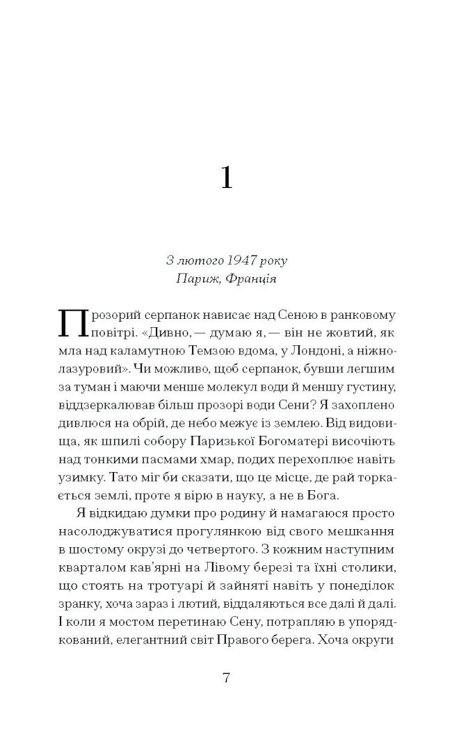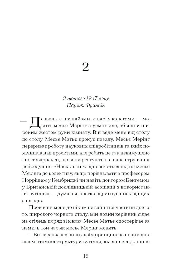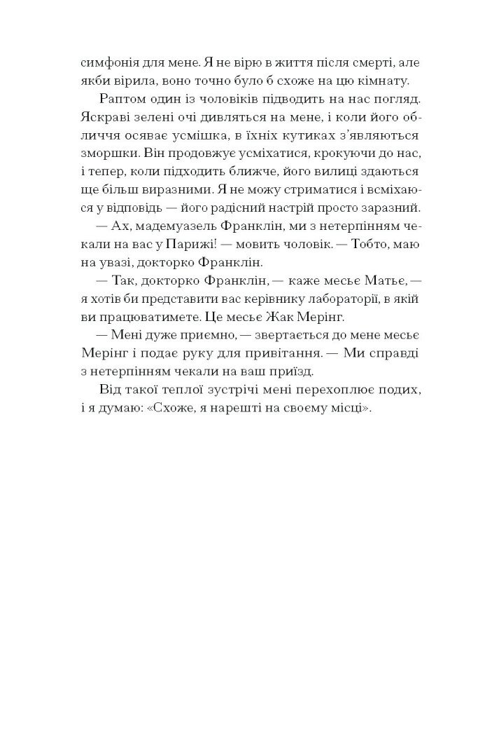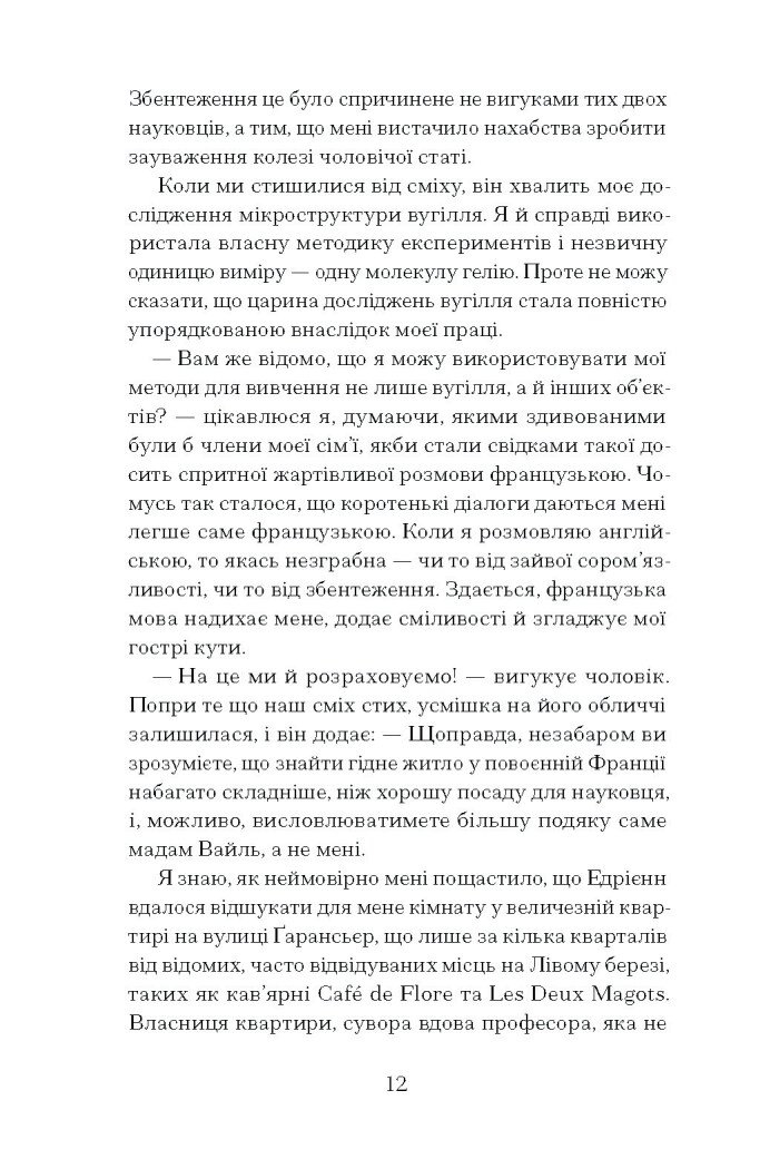 Марі Бенедикт з великою повагою до науки та феміністичного руху описує шлях Розалінд — від перших досліджень до участі у визначенні структури ДНК. Особливу атмосферу твору надає майстерний переклад Яни Литвин, який передає емоції, інтелект і напругу епохи.