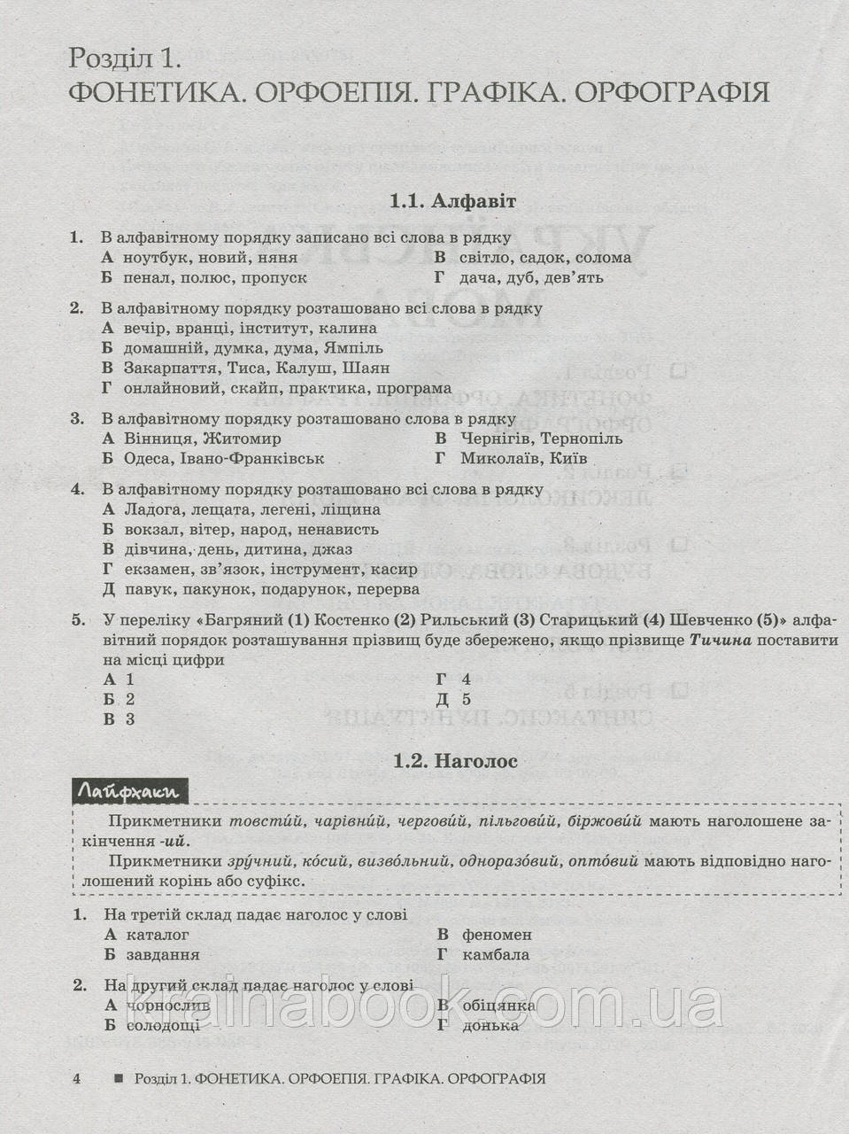 • БІЛЬШЕ 2000 ТЕСТОВИХ ЗАВДАНЬ • Понад 140 тематичних блоків • Тестові завдання до кожної теми програми • Усі типи завдань сертифікаційної роботи • Відповіді до ВСІХ тестових завдань + Лайфхаки з української мови
