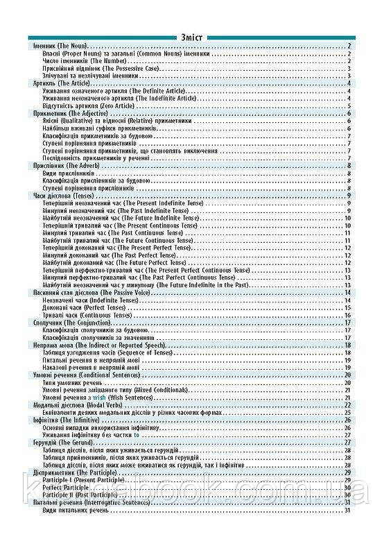Довідник з англійської мови допоможе учням 7-11 класів покращити свої знання та підготуватися до самостійних чи контрольних робіт, а також незалежного оцінювання. Інформація подана стисло та чітко у вигляді таблиць, що спрощує пошук потрібної інформації — правил граматики, визначень чи схем побудови граматичних конструкцій.