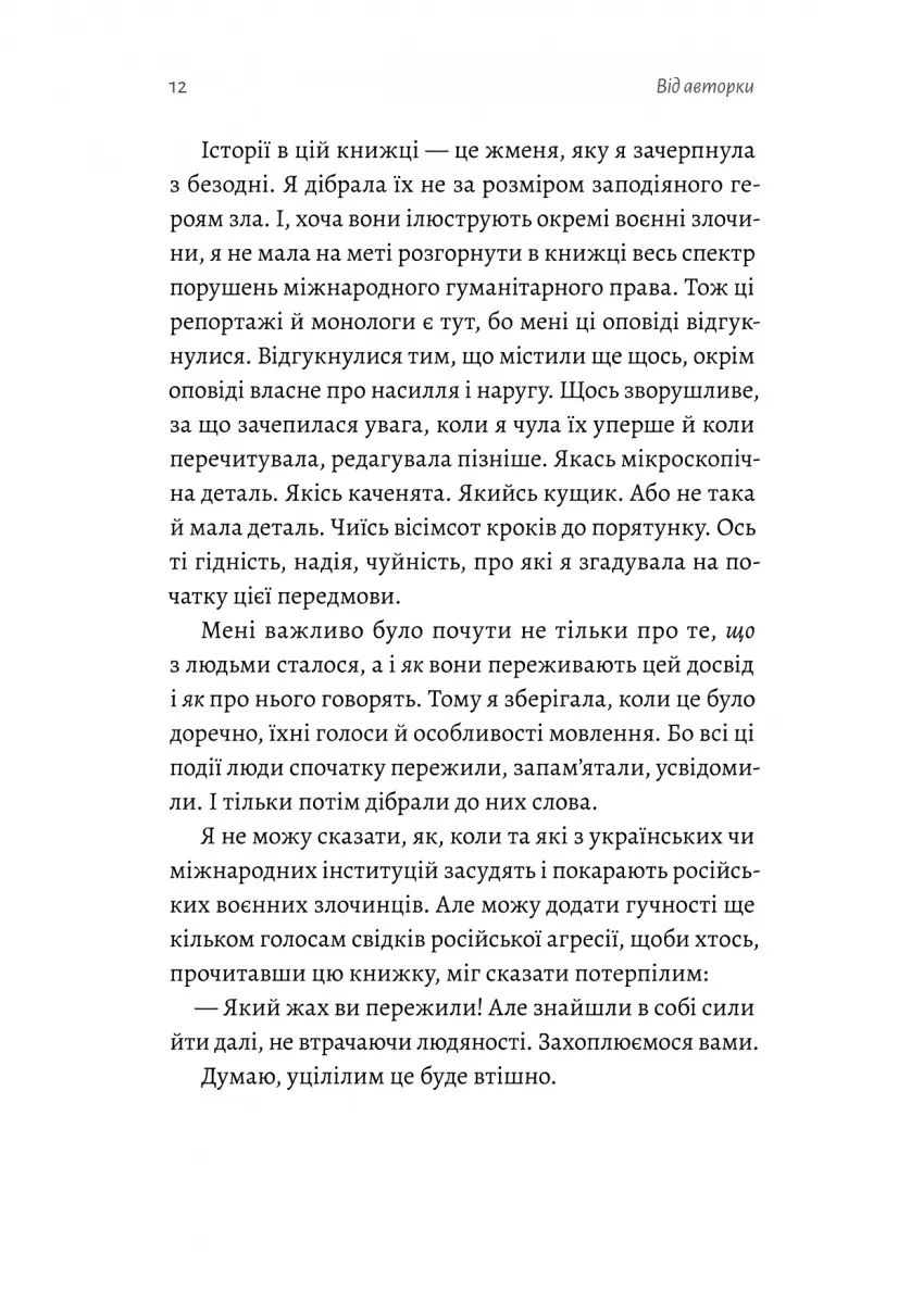 Ця документальна праця наповнена історіями мешканців сіл та міст: Ягідного, Снігурівки, Шевченкового та інших населених пунктів України. Вони стали жертвами воєнних злочинів, свідками масових розстрілів, катувань, зґвалтувань та руйнувань. Ці свідчення — не лише хроніка загарбницьких злодіянь. Це також розповіді про людську силу, гідність і незламність.