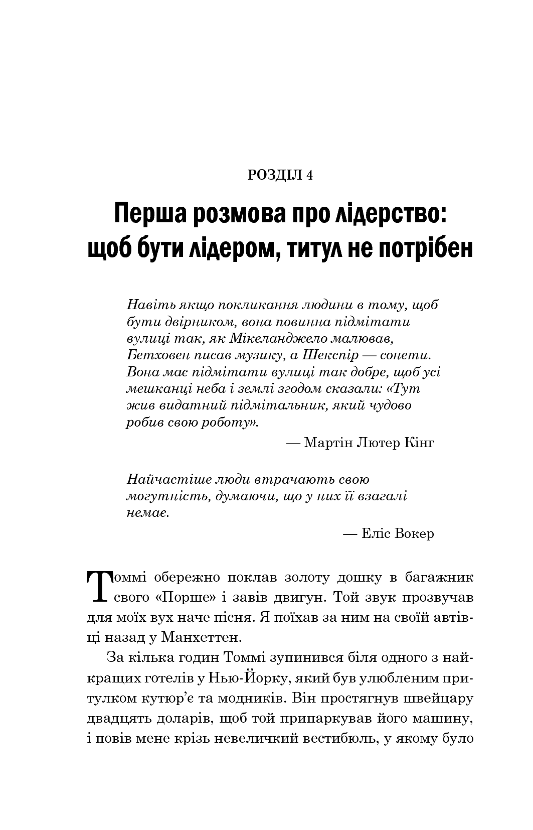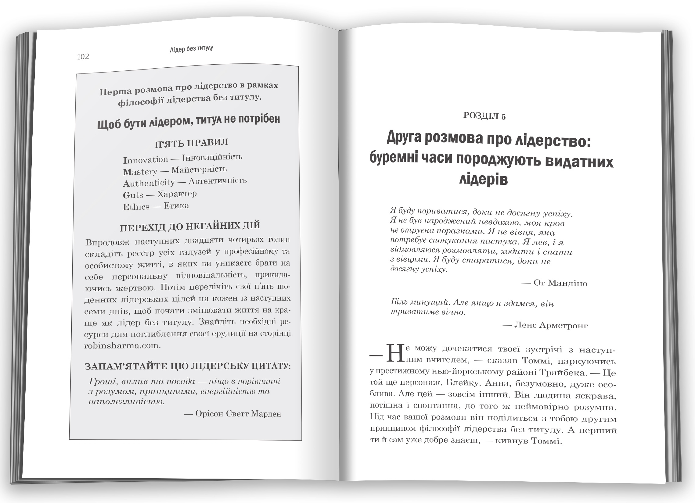 Цей практичний посібник відмовляється від застарілих уявлень про лідерство. Робін Шарма доводить, що лідерство — це не посада, а підхід до життя. Автор переконаний: щоб бути впливовим, не обов’язково мати офіційний титул чи статус. Достатньо рішучості, дисципліни та внутрішньої сили.