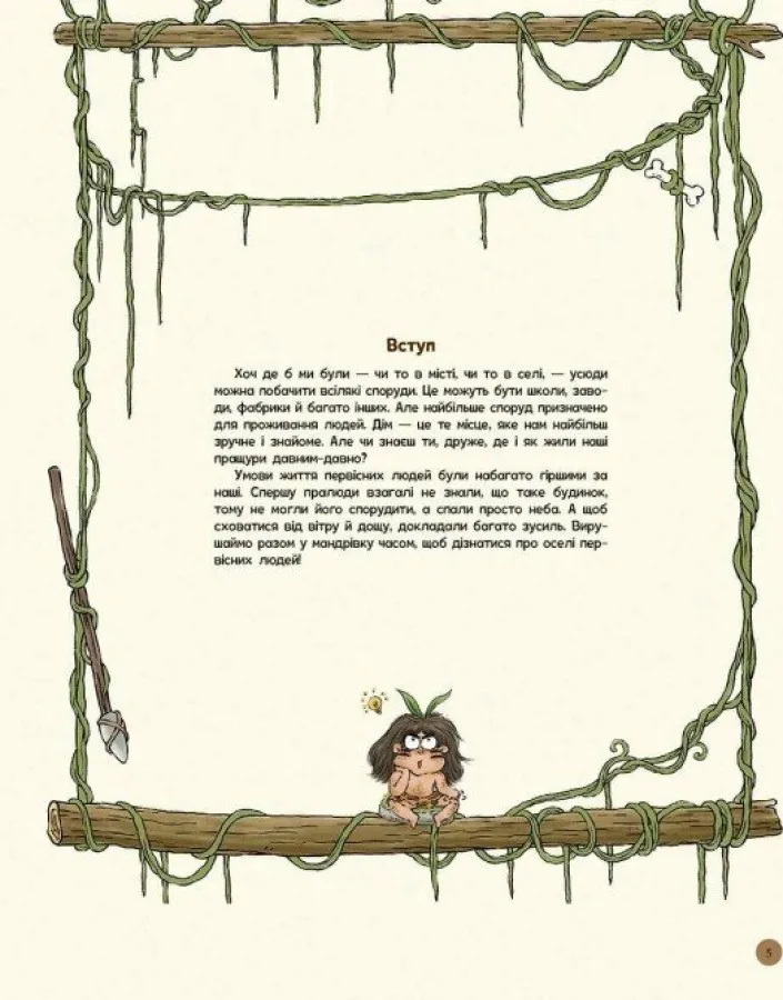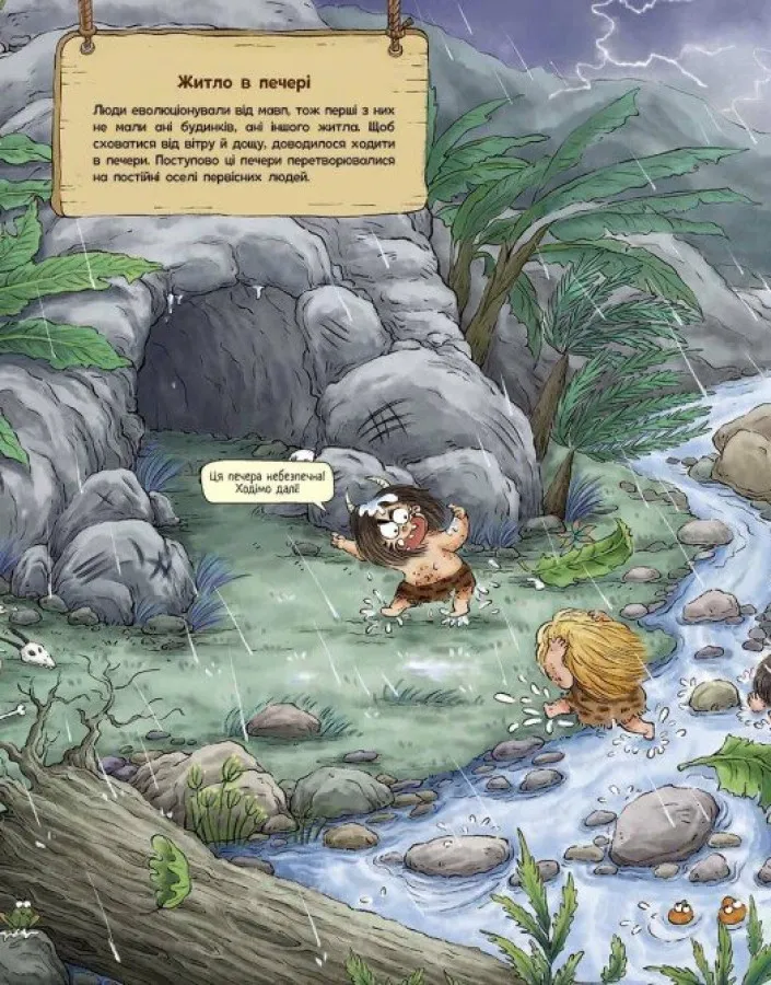 Книга доступною мовою розповідає про те, як змінювалося житло в первісні часи. Від проживання просто неба до печер, хатин з гілок і перших примітивних землянок. В процесі читання дитина простежить еволюцію помешкань: