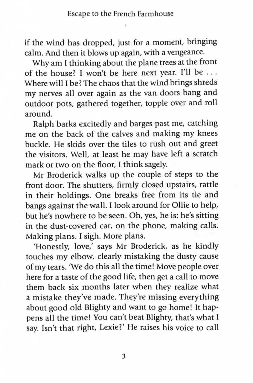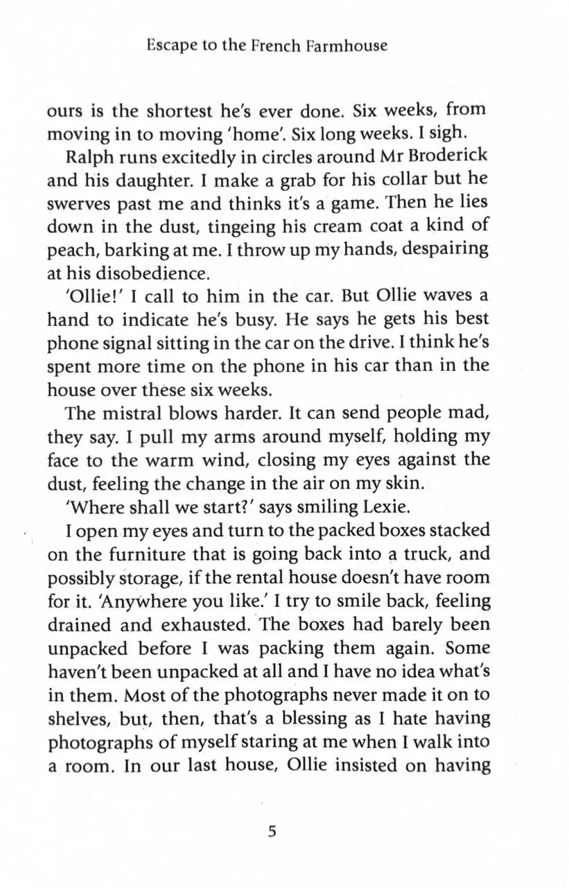 Дел і її чоловік Оллі переїхали до чарівного села в Провансі, сподіваючись на новий початок після багаторічної боротьби з безпліддям. Але вже через шість тижнів вони знову вантажать речі до машини. Коли Дел спостерігає, як фургон рушає назад до Англії, її раптово осягає: справжнє щастя — у новому житті у Франції… без Оллі.