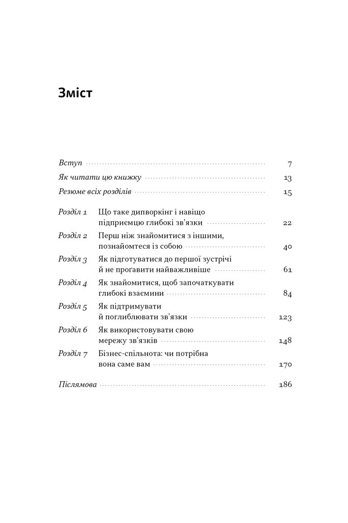 Дипворкінг (похідне від нетворкінг) — це мережа ваших глибоких зв’язків. Такі люди мають з вами набагато більше спільного, аніж тільки хобі чи рід діяльності. Ви об'єднані на вищих рівнях — місії, цінностей і переконань. Дипворкінг — це тренд майбутнього. Запит на побудову глибоких зв'язків лише виникає. У майбутньому він посилюватиметься. Тож саме зараз варто інвестувати свій час у вибудовування глибоких зв’язків. Навіщо? Можна навести багато практичних вигод: знаходити партнерів, створювати нові проєкти, масштабувати бізнес, ефективно виконувати завдання. Але за всім цим стоїть досить проста й водночас складна перевага: глибокі зв'язки допомагають нам бути щасливими. Тому пропоную вам поринути у світ дипворкінгу — вміння вибудовувати глибокі зв'язки. Це перша в світі книжка, що розкриває потенціал дипворкінгу, і, надає всі інструменти для методичного вибудовування глибоких зв’язків.