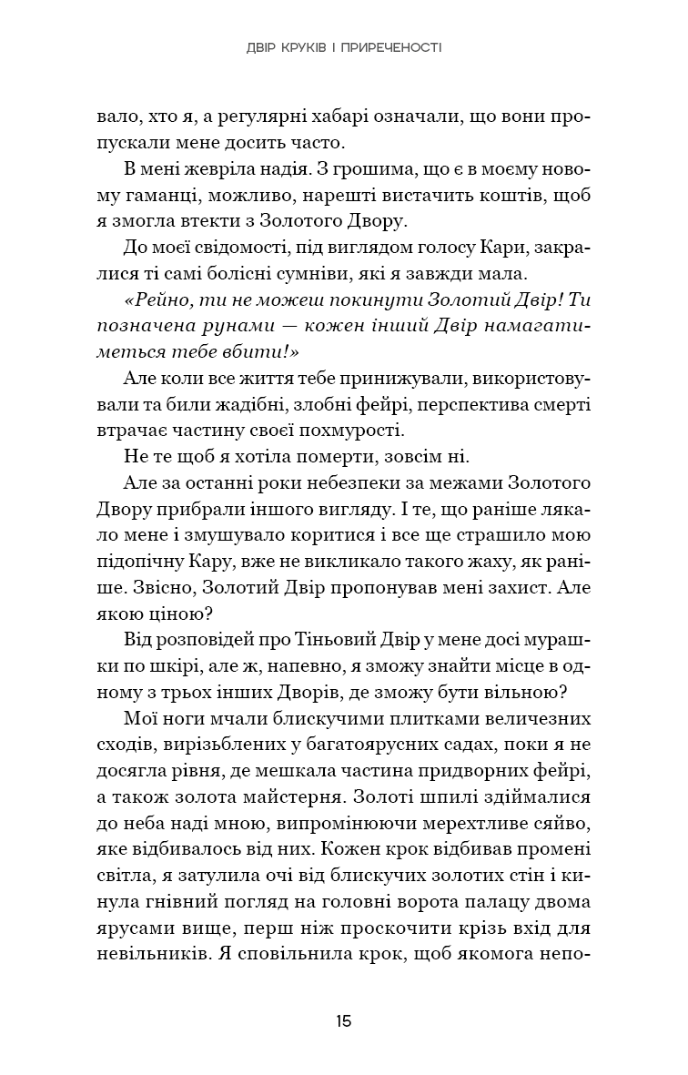 Походження Рейни оповито таємницею, вона найцінніша рабиня Золотого Двору. Маючи винятковий дар відчувати золото і майстерно працювати з ним, вона приречена провести своє життя в розкішному палаці жорстоких і жадібних фейрі. Одного дня на палац вчиняють напад, і дівчина вирішує, що це її шанс на втечу. Нападників очолює представник Тіньового Двіру — найжахливішого з усіх наявних — таємничий принц фейрі, чиє обличчя приховує маска. І йому потрібне лише одне. Вона. Мідноволоса людина, позначена рунами.