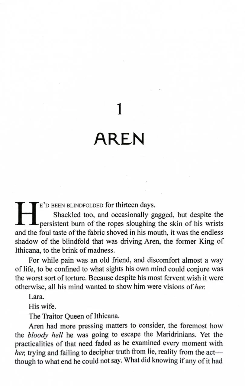 Lara has watched Ithicana be conquered by her own father. But when she learns her husband, Aren, has been captured in battle, Lara knows her father is only keeping him alive to lure in his traitorous daughter.