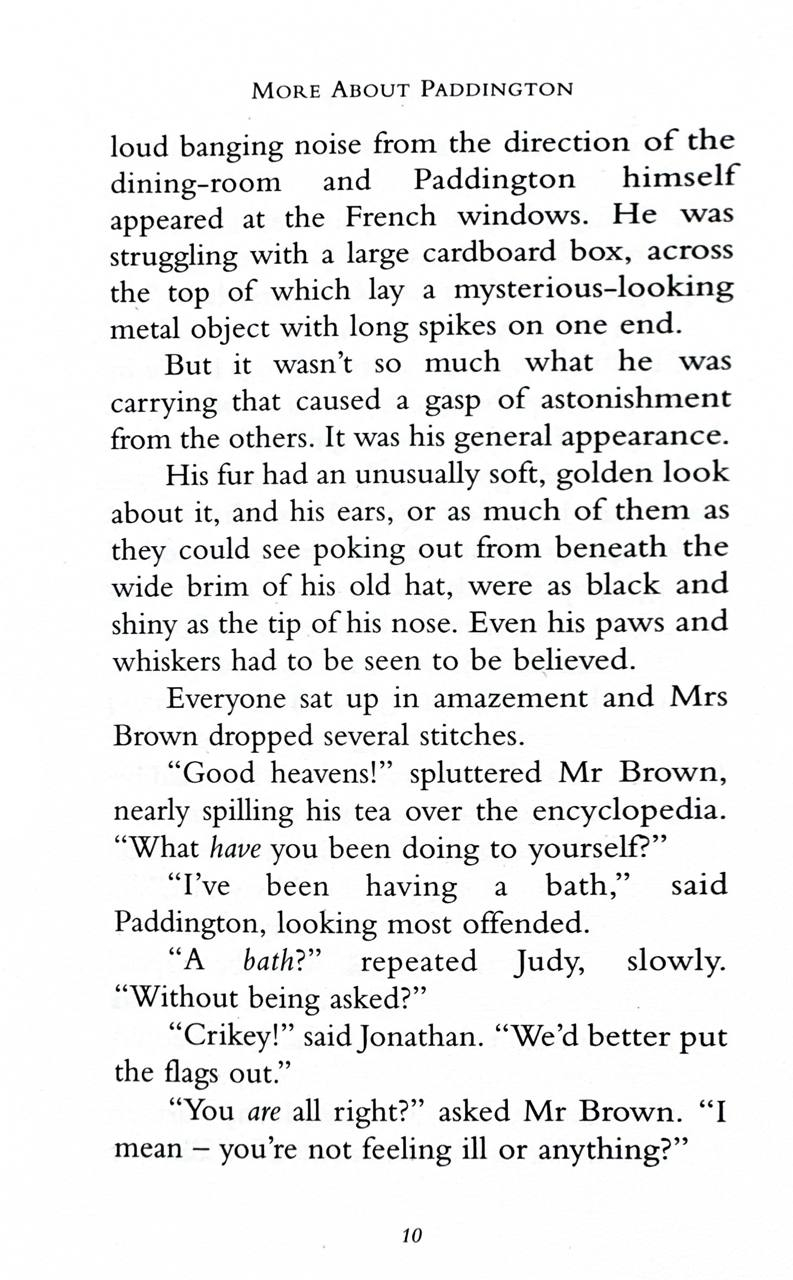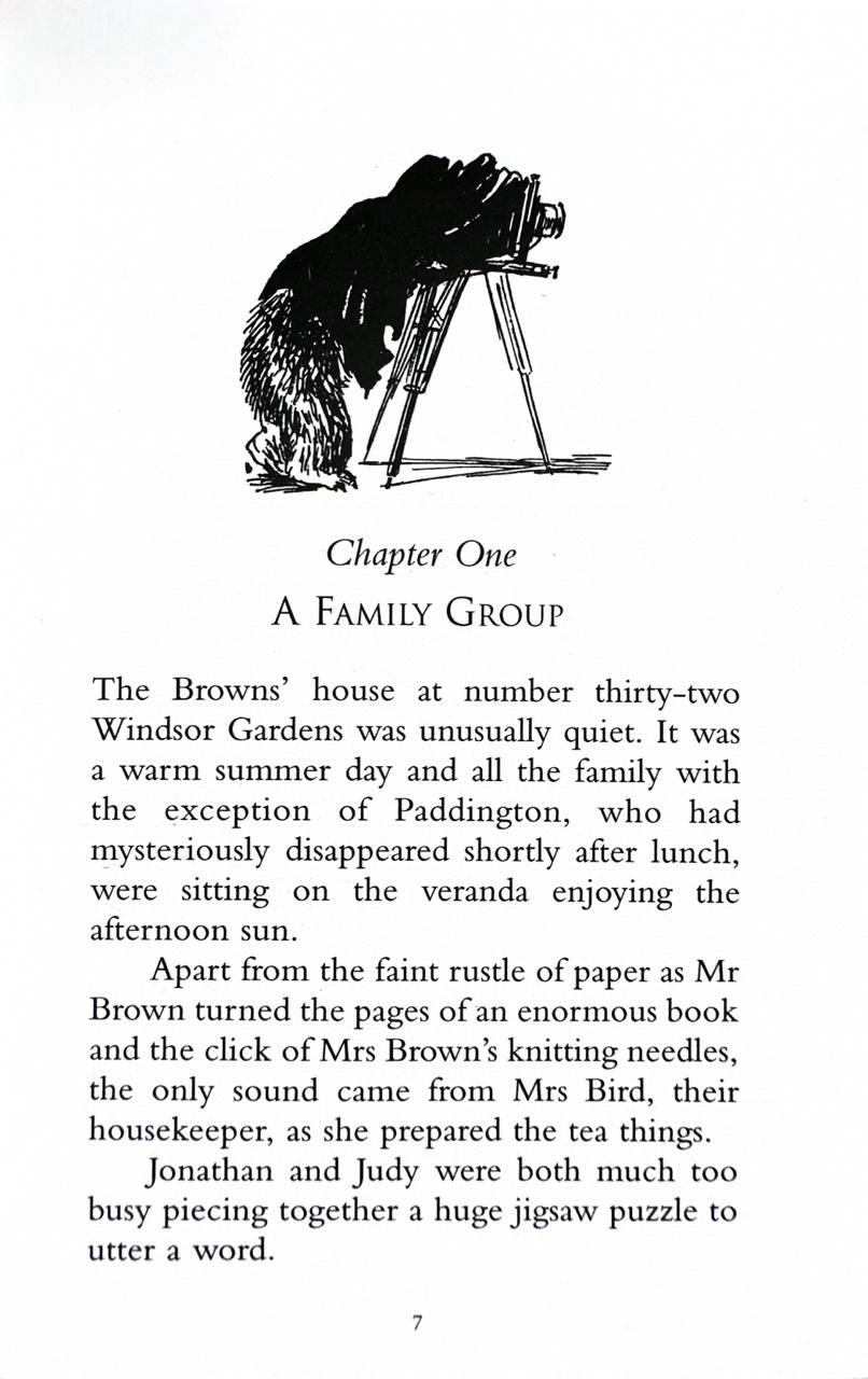 "Bears like Paddington are very rare," says Mrs Bird, "and a good thing too, or it would cost us a small fortune in marmalade." The Brown Family first met Paddington on a railway station -- Paddington station, in fact -- and now he is just another member of their family, if a slightly unusual one. As he says himself, "Things happen to me -- I'm that sort of bear." With his attempts at home decorating, detective work and photography, the Brown family soon find that Paddington causes his own particular brand of chaos.