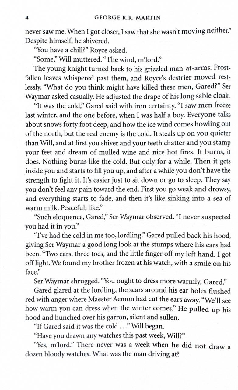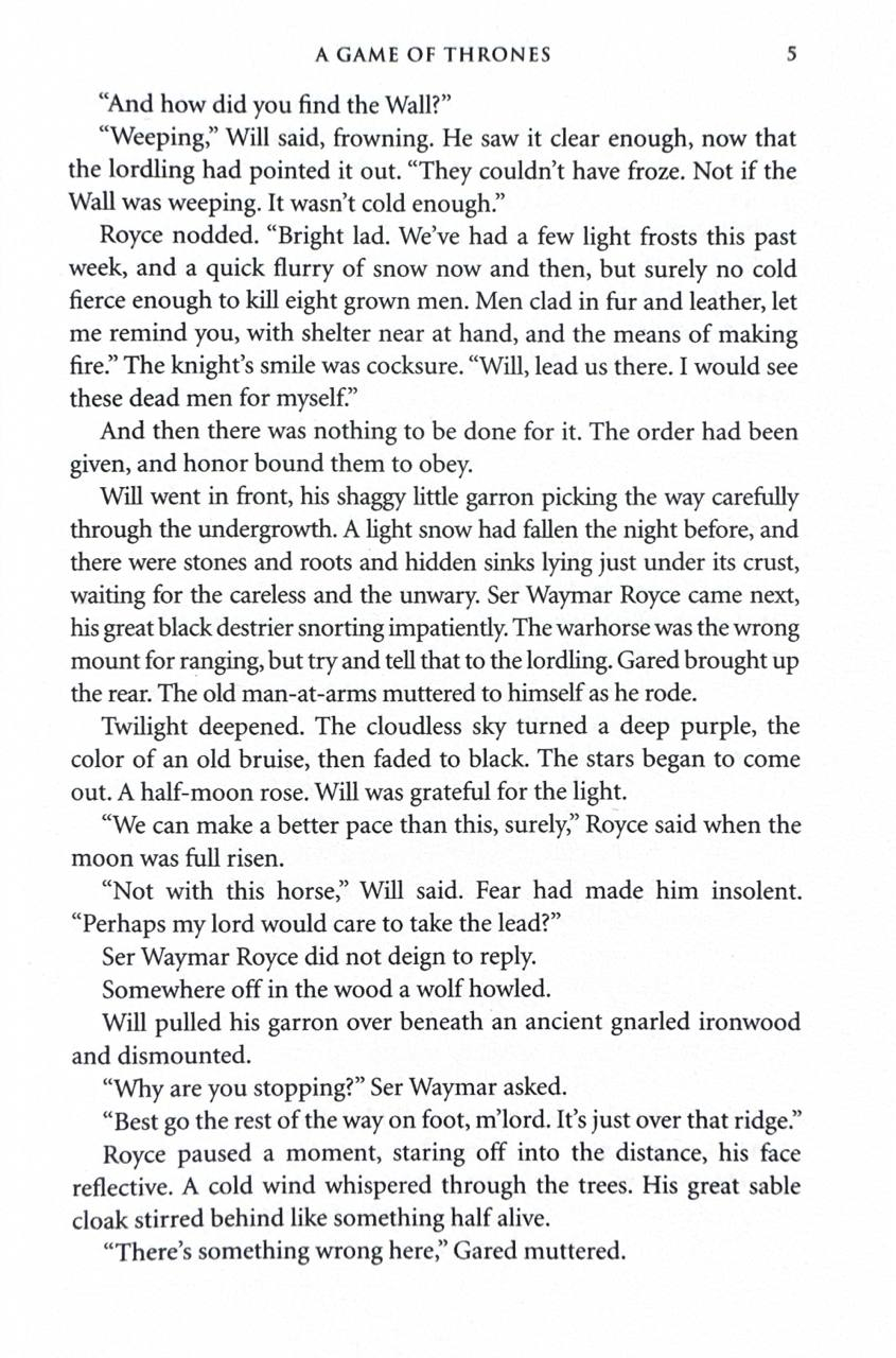 Як Володар Півночі, лорд Едард Старк сприймає новину про своє призначення Десницею короля як прокляття. Його честь обтяжує його при дворі, де справжній чоловік чинить так, як хоче, а не так, як повинен… і ворог, убитий вчасно, — це справжня краса.