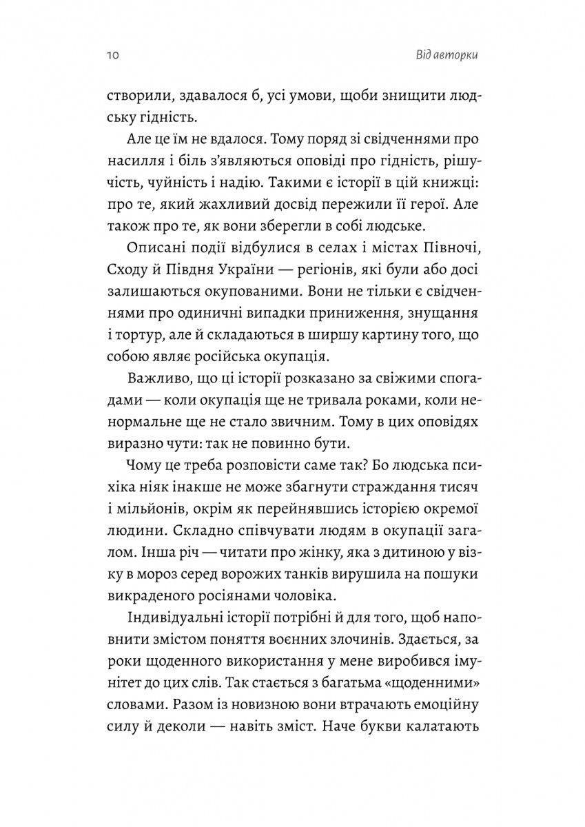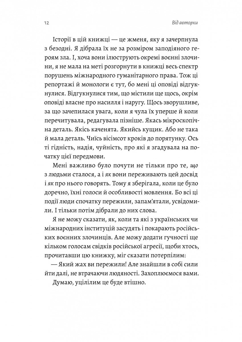 Впродовж 2022–2024 років журналістка Світлана Ославська документувала свідчення воєнних злочинів, які росіяни скоїли на окупованих територіях України. Авторка спілкувалася з уцілілими в Снігурівці, Шевченковому, Ягідному й інших містах і селах, що пережили окупацію. Ці люди буквально на власній шкірі зазнали терору російського вторгнення. Вони були свідками того, як розстрілювали їхніх близьких. Як знищували будинки, вулиці й цілі міста. Пережили тортури і нелюдське поводження, викрадення, зґвалтування. Але росіянам не вдалося позбавити цих людей гідності.