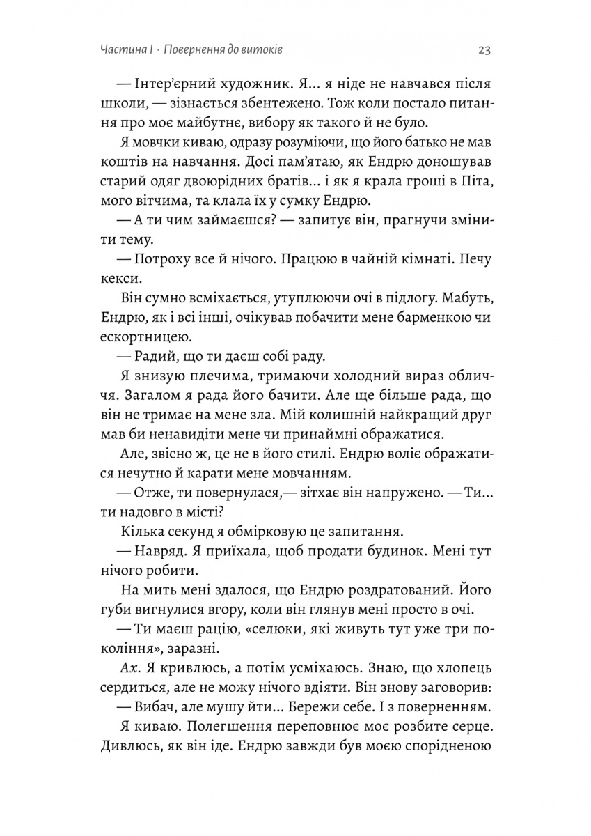 Азалія повертається, а все навколо нагадує їй про сповнене болю і страху минуле. І лиш новий загадковий сусід Іден, який здається таким же загубленим у цьому світі, як і вона сама, вперше повертає усмішку на її обличчя. І хоча вона заприсяглася ніколи не мати почуттів до чоловіка, він перевертає її світ. Але чи готова вона поділитися таємницями власної змученої душі?