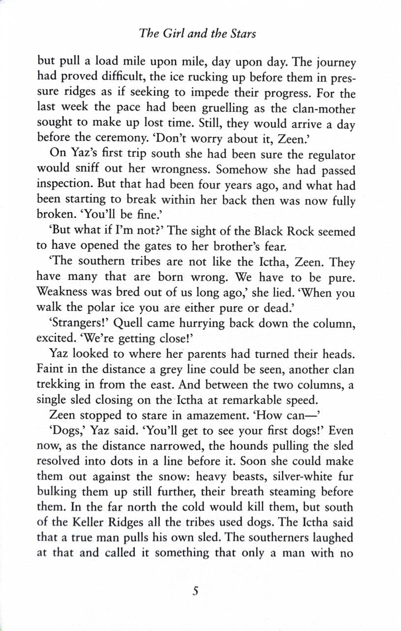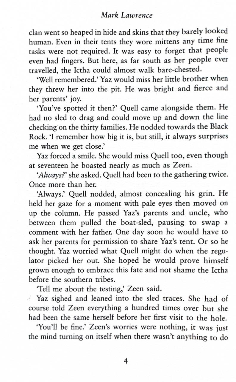 East of the Black Rock, out on the ice, lies a hole down which broken children are thrown On the vastness of the ice there is no room for individuals. No one survives alone. To resist the cold, to endure the months of night when even the air itself begins to freeze, requires a special breed. Variation is dangerous, difference is fatal. And Yaz is different.