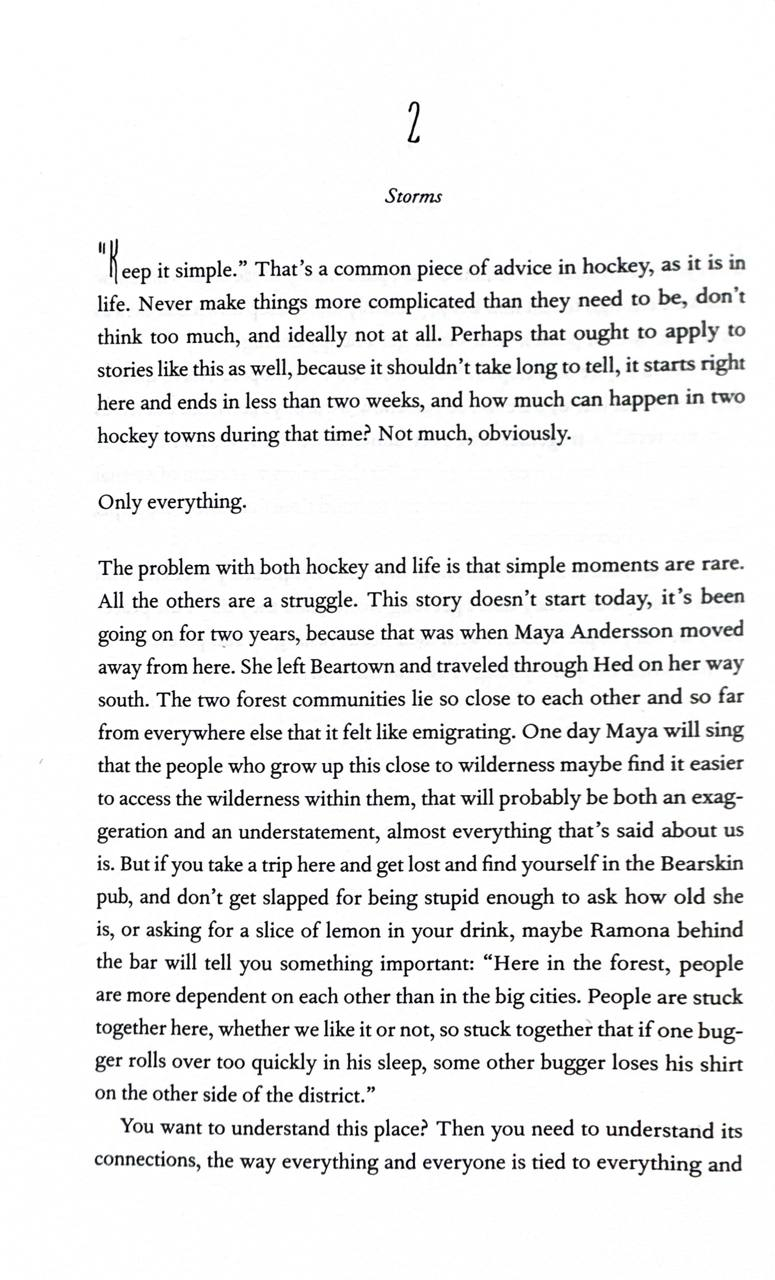 The destruction caused by a summer storm reignites the old rivalry between Beartown and the neighboring town of Hed, a rivalry which has always been fought through their ice hockey teams. Tensions between the two towns turn into acts of intimidation and then violence.