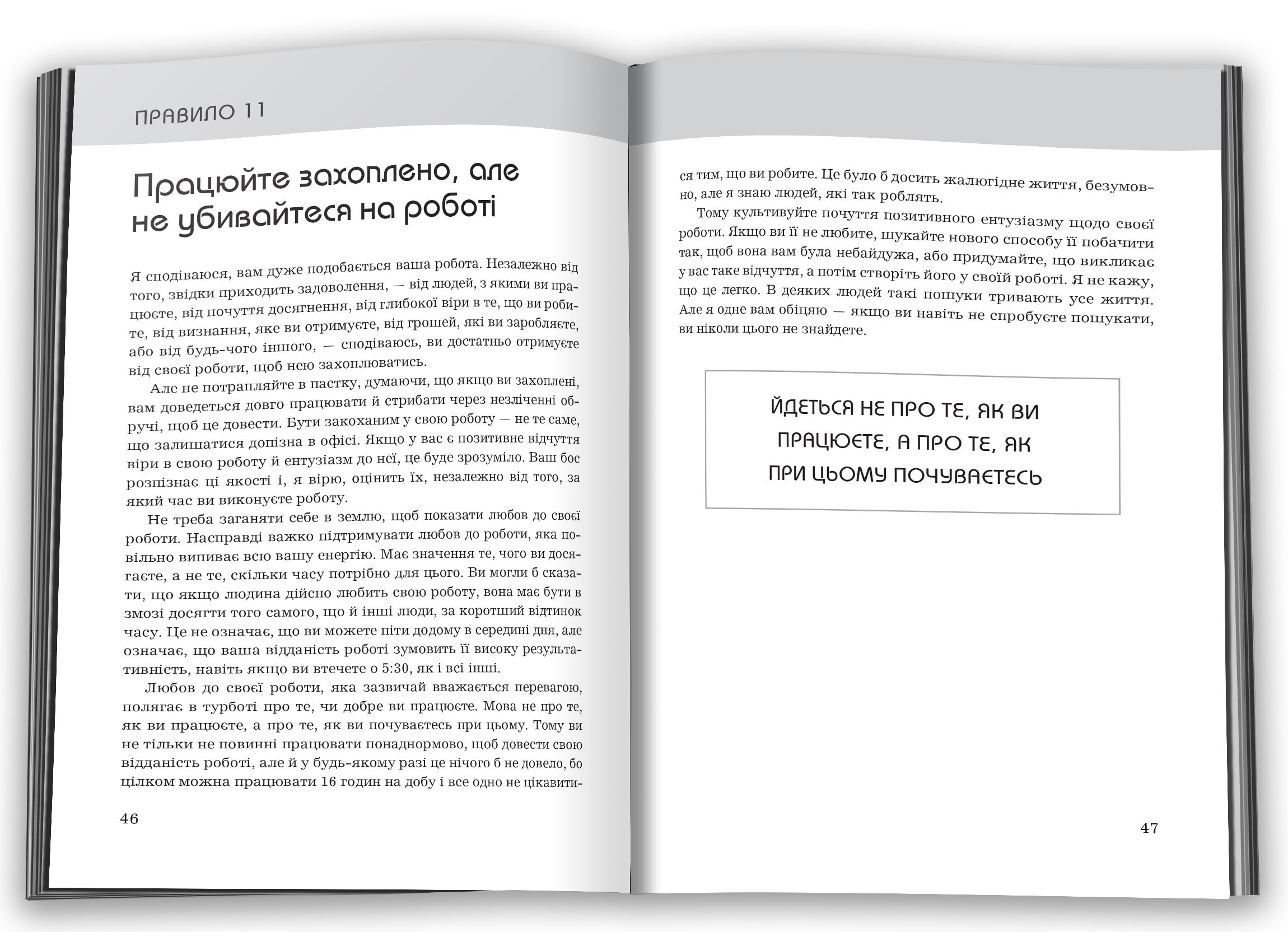 Правила кар'єри — це результат багаторічного досвіду та аналітики соціальної поведінки на роботі. Автор докладно описує 100 золотих правил, які допоможуть не тільки вдосконалити навички, а й підійти до роботи з іншим світоглядом. Вже понад рік книга лишається в топі продажів у категорії літератури з особистісного зростання, підтверджуючи свою ефективність у реальному житті.
