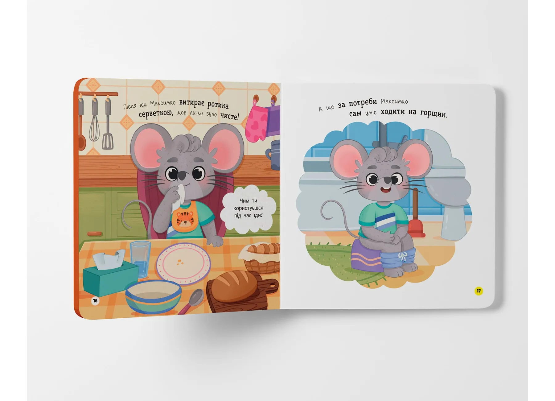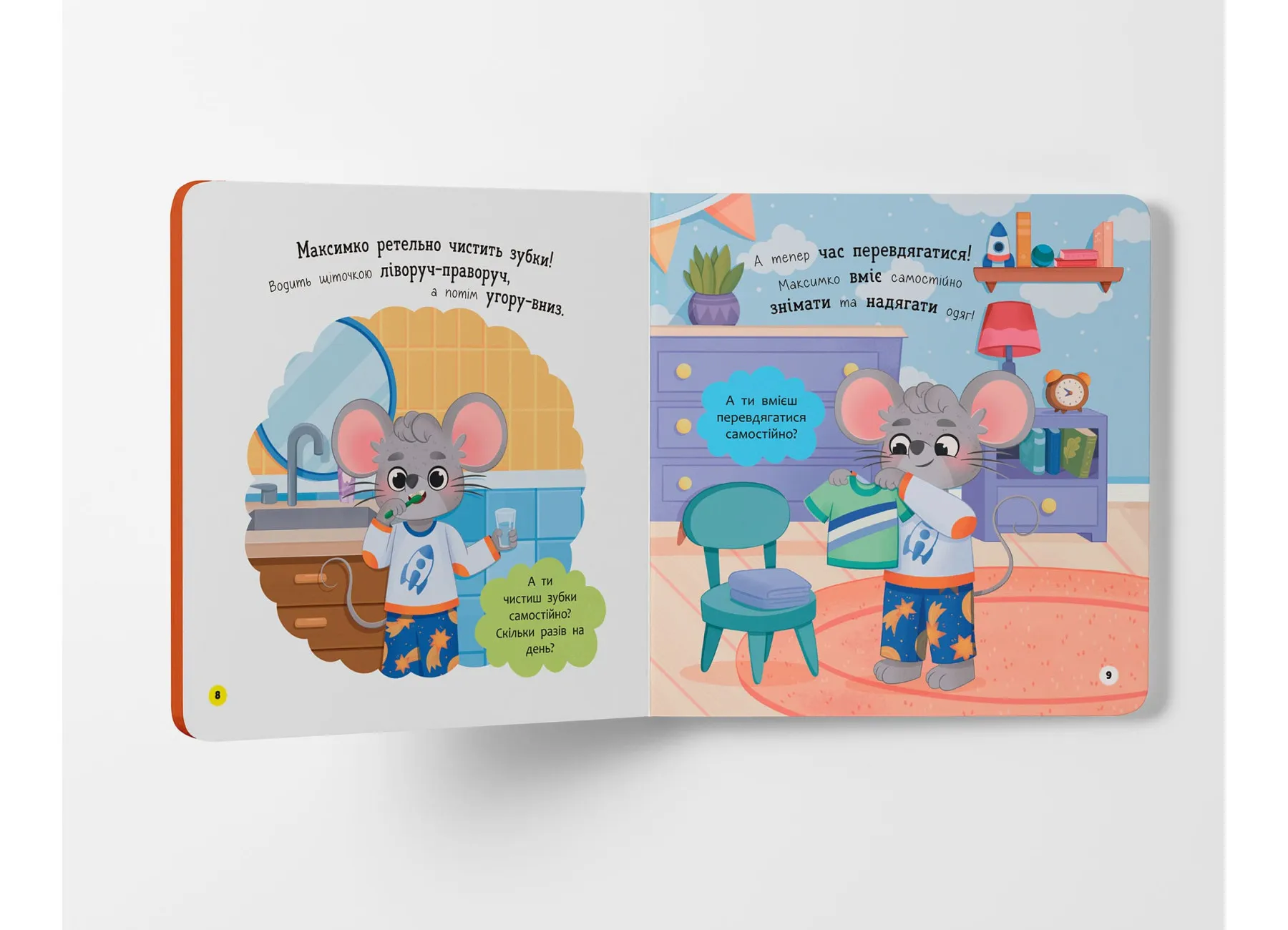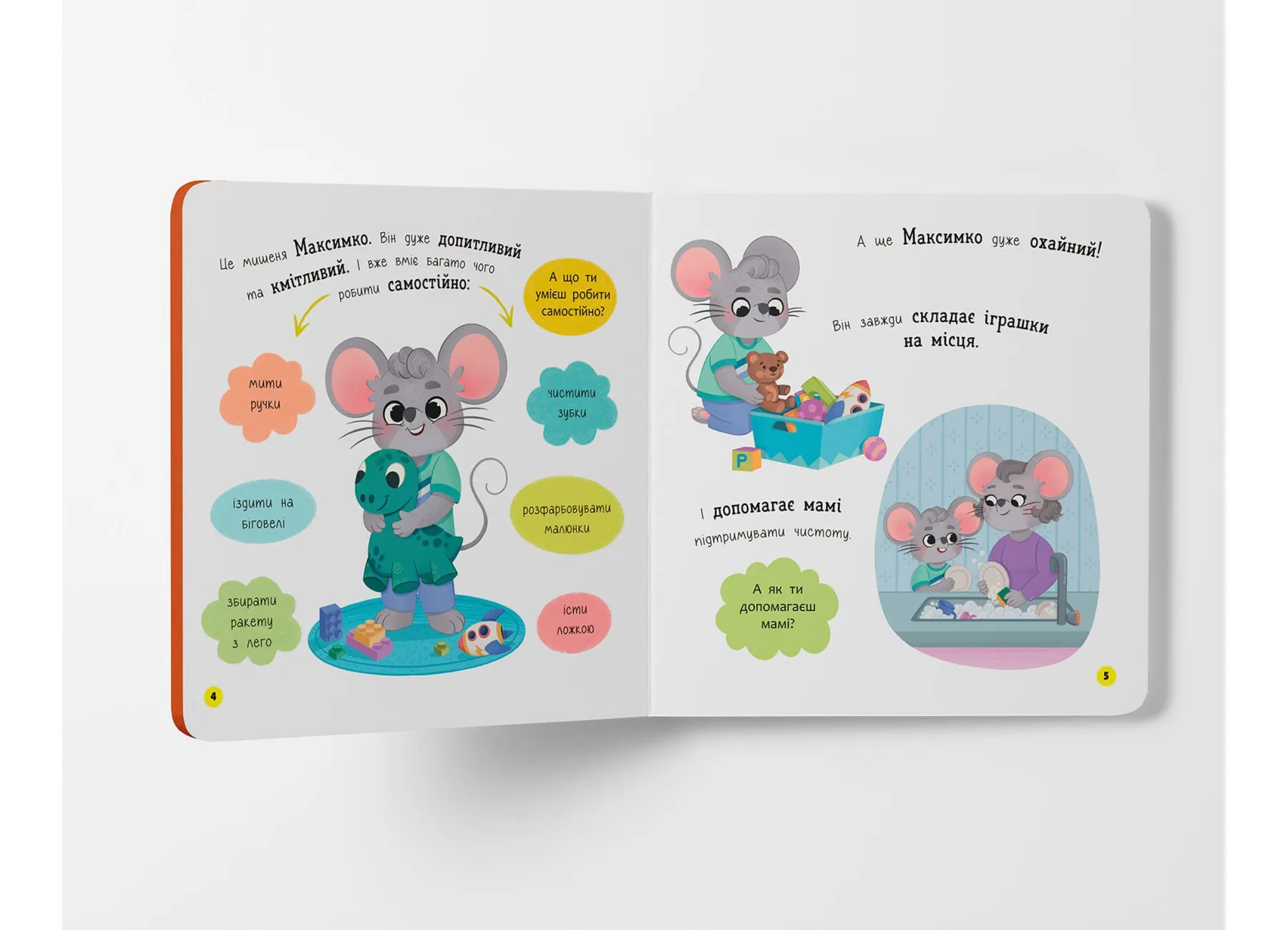 На кожній сторінці малюк зустрічатиме веселого персонажа — мишеня Максимка, який охайно вмивається, чистить ручки, дбає про чистоту свого одягу, підстригає нігтики й підтримує порядок у своїй кімнатці. Таке подання матеріалу спонукає дитину наслідувати поведінку героя, засвоюючи важливі щоденні ритуали.