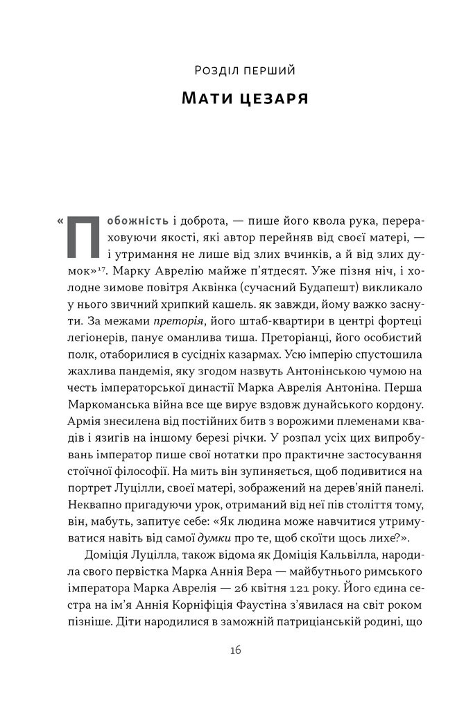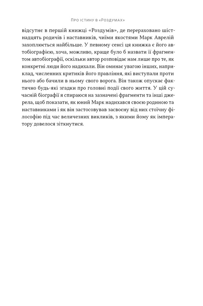 Книга не є пересічною історичною працею — це практичний путівник із філософії лідерства. Автор досліджує, як і чому Марк Аврелій став прикладом цілісності, уміння тримати внутрішній баланс навіть у найскладніші часи. Незважаючи на поразку у батьківській справі — його син Коммод не став гідним правителем — імператор залишив нам приклад стійкості та гідності, який актуальний і досі.