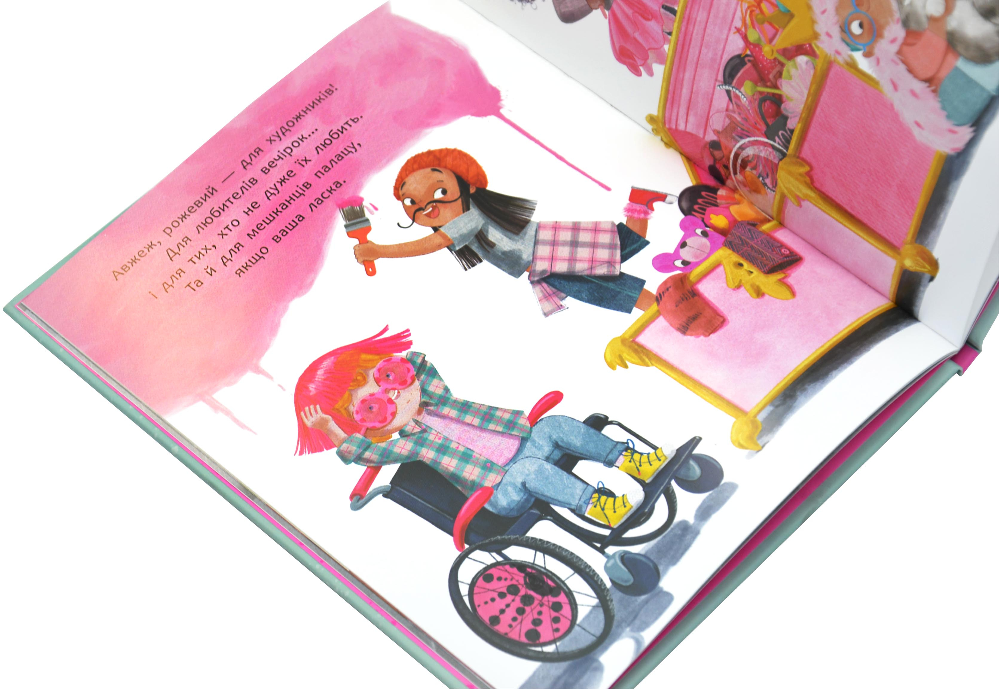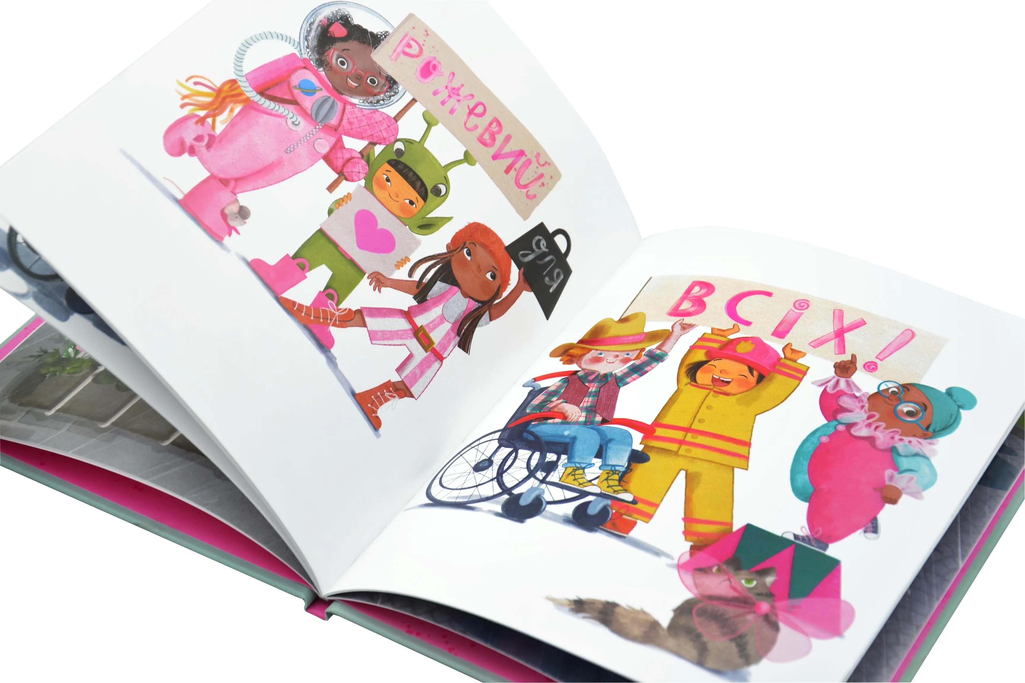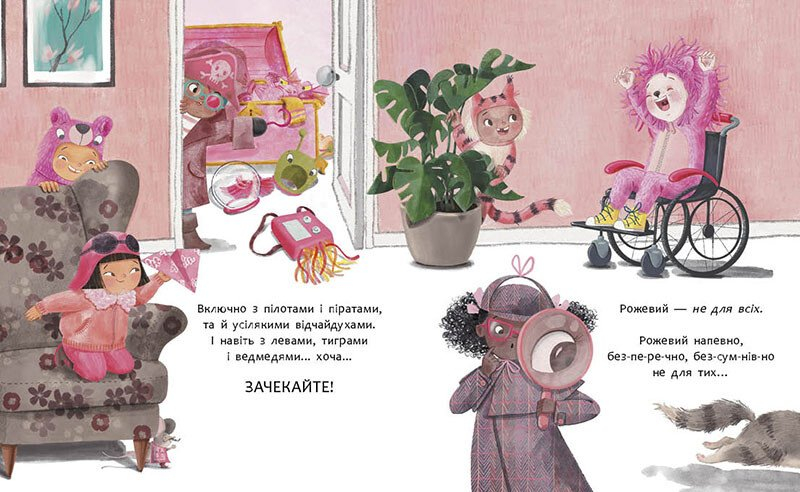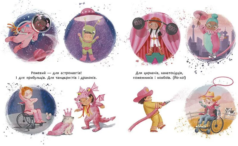 Ця книга надихає дітей експериментувати з кольорами, стилями, іграшками та рольовими іграми. Рожевий тут стає символом свободи вибору: він для ґудзиків і шкарпеток, для дівчаток і хлопчиків, астронавтів, прибульців, танцюристів, пожежників і навіть драконів. Авторка зручно та просто показує, що кожна дитина має право бути собою і обирати те, що їй до вподоби.