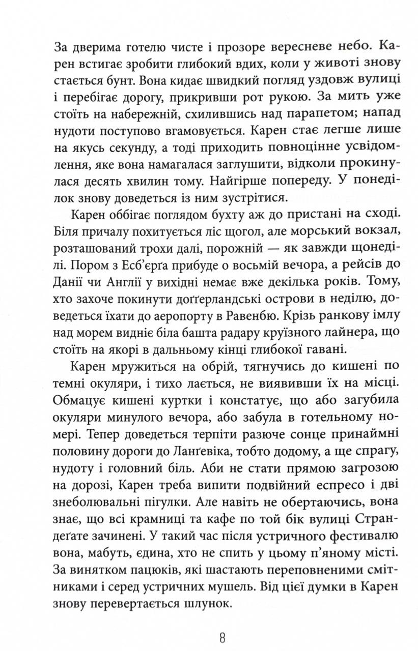 Пошук вбивці стає для Карен не лише професійним викликом, а й особистим випробуванням. Усе вказує на те, що злочин має глибокі корені в минулому Доґґерланда. Атмосфера тривоги, неоднозначних мотивів та психологічної напруги робить роман яскравим представником скандинавського нуару.