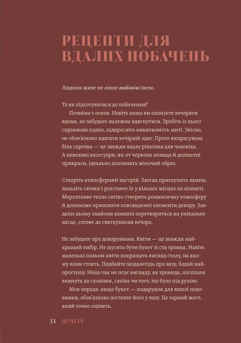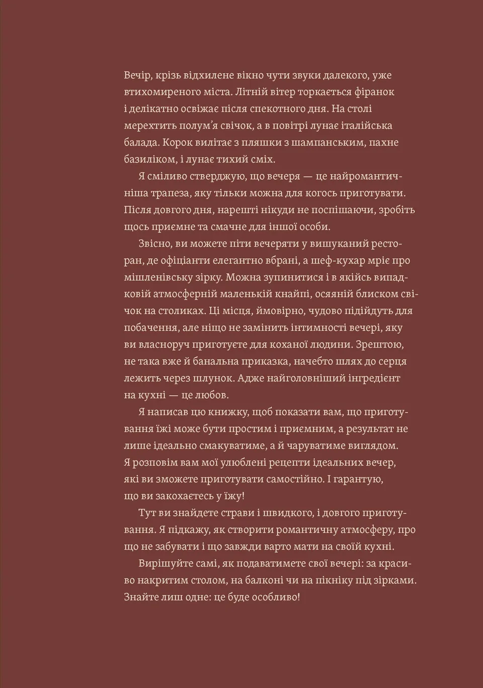 Книга Вечеря зі сніданком створена для тих, хто хоче дарувати тепло через кулінарію та перетворити звичайний вечір на романтичне свято.