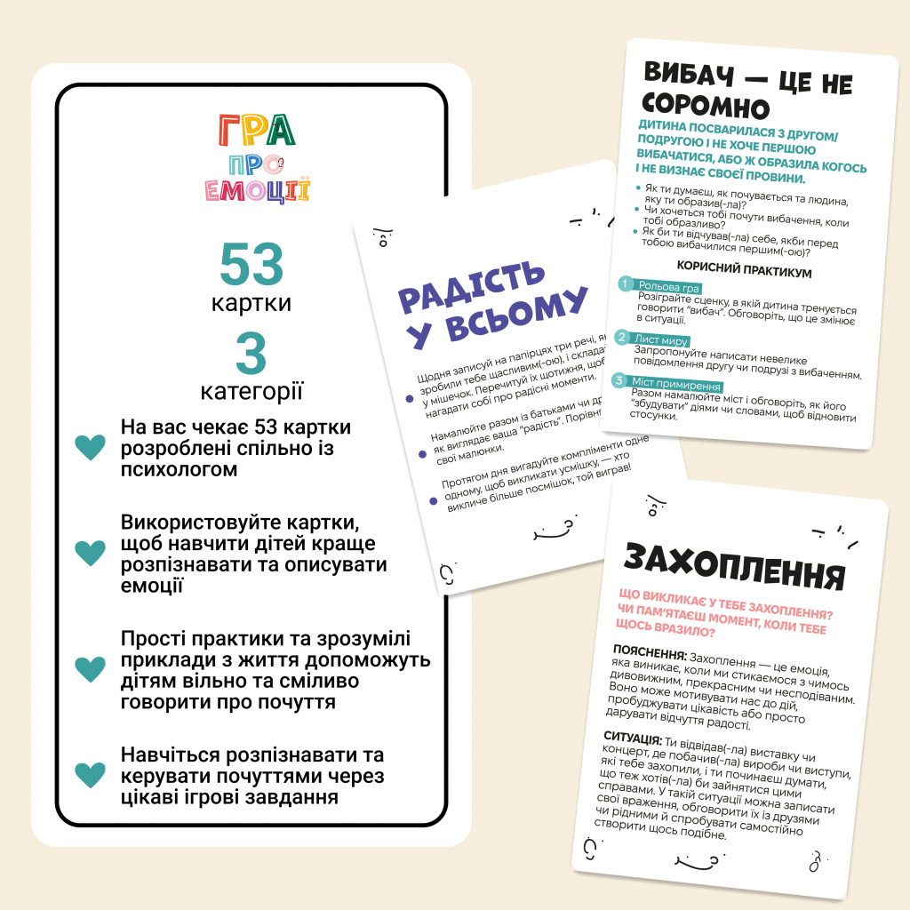 Кожна картка створена так, аби м’яко підштовхувати дитину до відкритого спілкування. Гра не передбачає правильних або неправильних відповідей — лише щирі відчуття, приклади з життя та пошук спільного рішення.