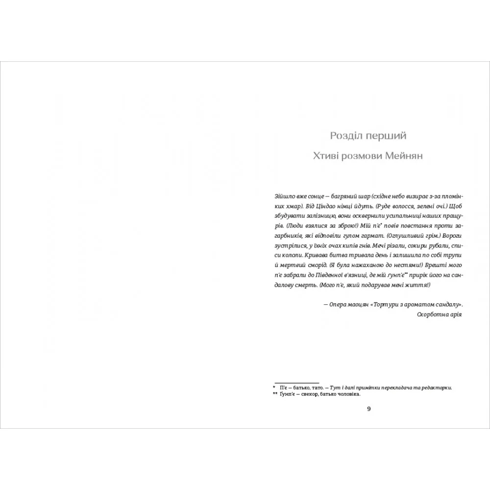 Сунь Мейнян — не просто спостерігачка, а повноцінна героїня. Через її переживання, втрати, силу і гідність автор занурює читача у світ, де межа між особистим і політичним дуже тонка. Її зв'язок із батьком, а також із двома іншими чоловіками — це пряма відсилка до пошуку ідентичності на тлі колективного болю та змін.