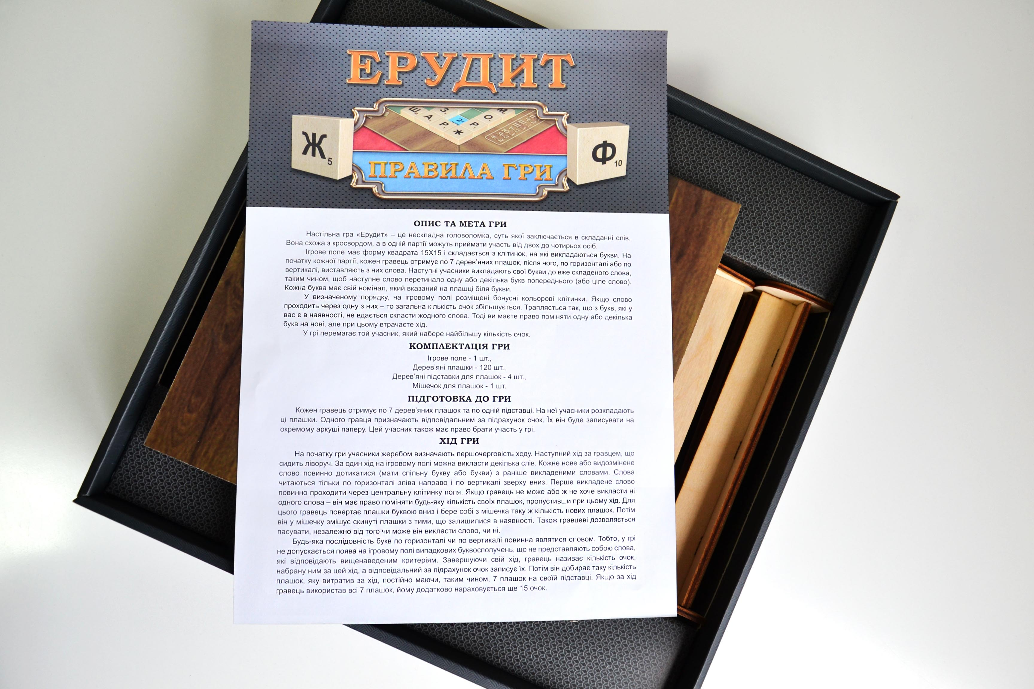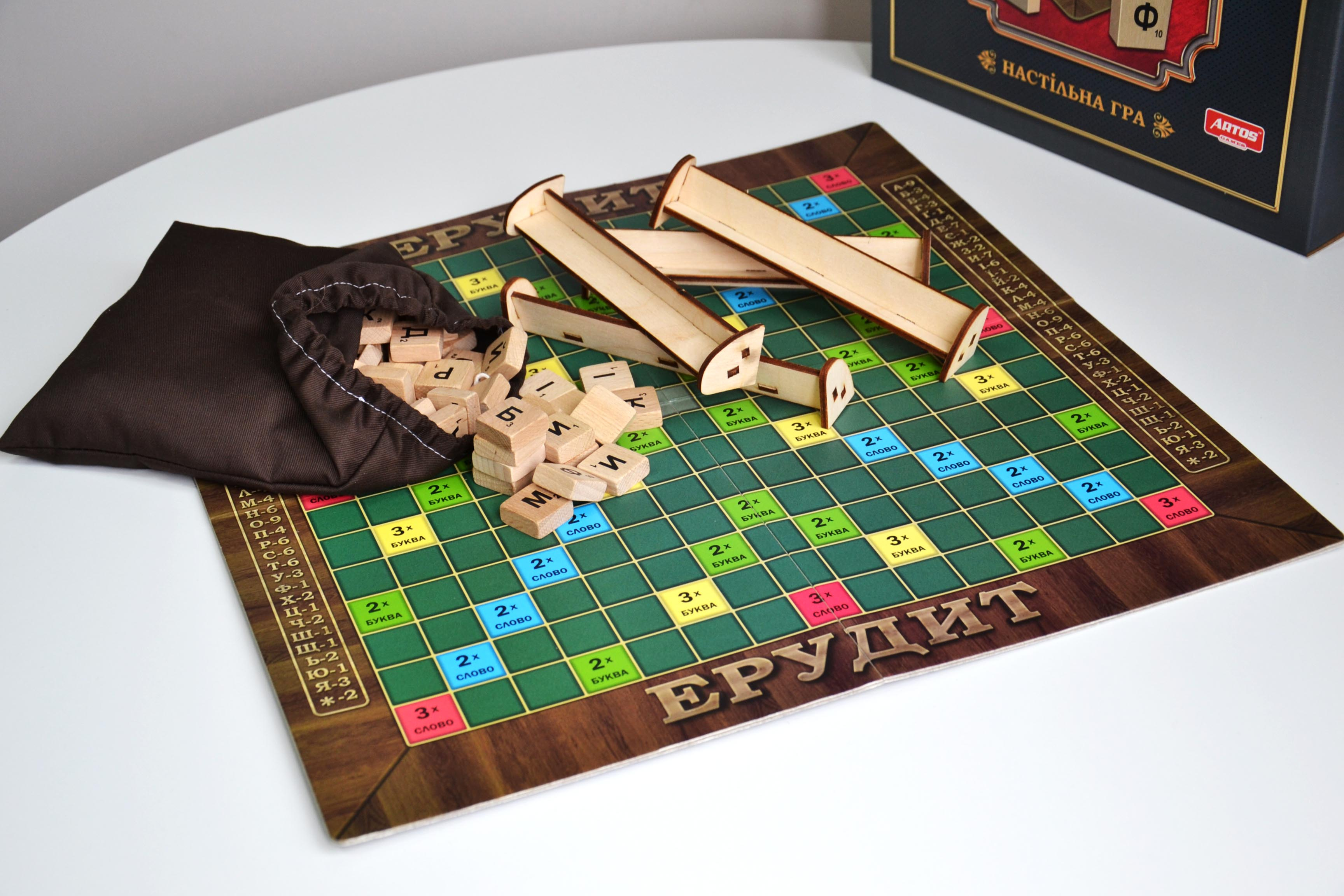 «ЕРУДИТ» – це надзвичайно захоплююча настільна гра, котра підходить для цікавого та корисного проведення часу у колі сім’ї та друзів. Вона розширює словниковий запас, тренує увагу та кмітливість. Це гра, у якій результат буде напряму залежати від ваших здібностей.