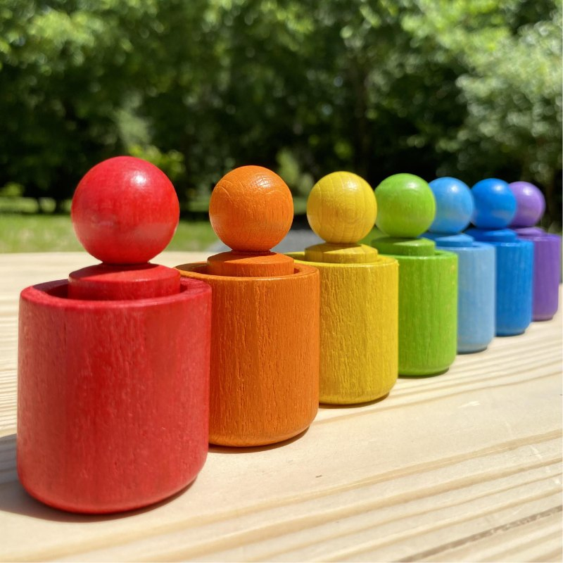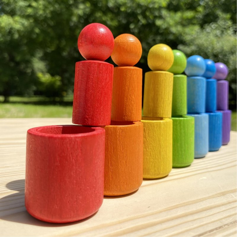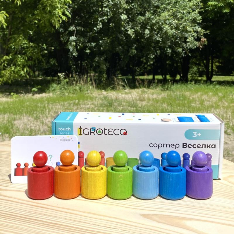 Дерев'яний сортер "Веселка" — це набір стаканчиків та фігурок чоловічків у яскравих райдужних кольорах.