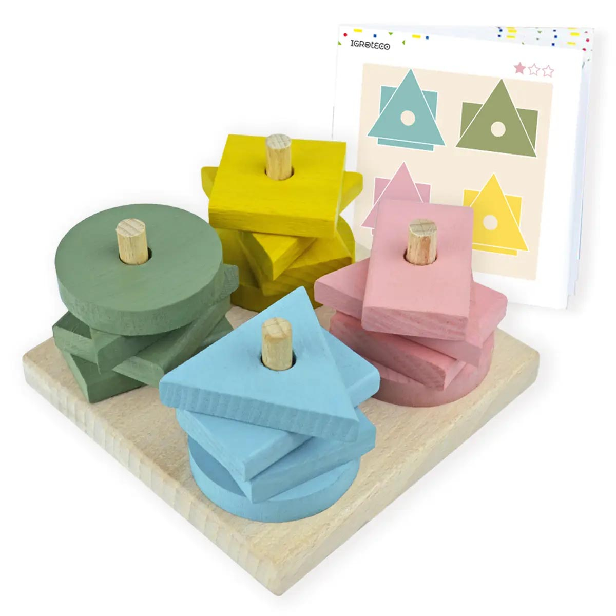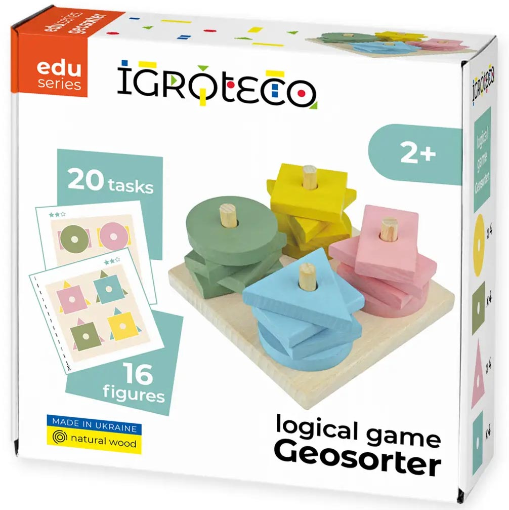 Навчання має бути цікавим! З ІГРОТЕКО можна складати, нанизувати, будувати й при цьому вчитися новому. Геосортер представляє собою дощечку з чотирма штирями для нанизування і набір чотирьох типів геометричних фігур з отвором посередині. Квадрати, прямокутники, трикутники, круги пофарбовані у чотири різні кольори приємної пастельної гами.