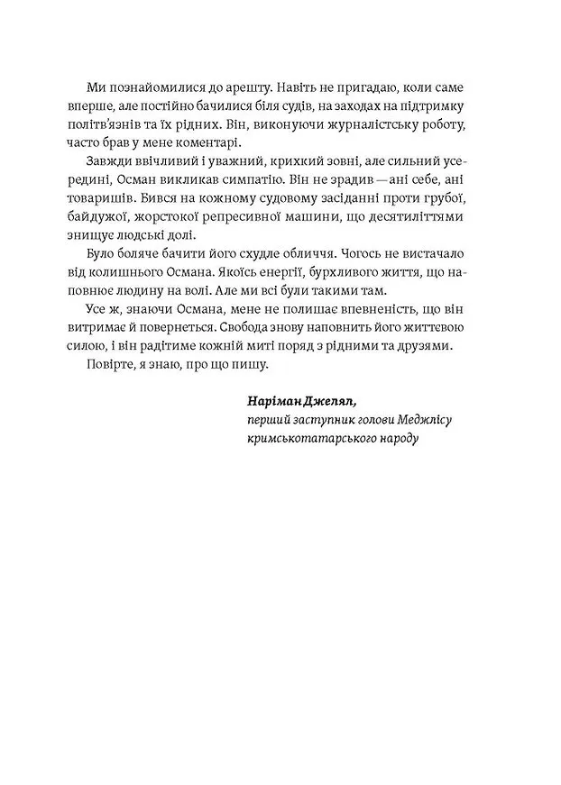 Осман Аріфмеметов — це не просто автор, а голос народу, що переживає систематичні репресії. У 2019 році його незаконно увʼязнили в окупованому Криму за сфабрикованими звинуваченнями у терористичній діяльності. Його книга — це збірник репортажів, які він вів безпосередньо в слідчому ізоляторі — щоденник життя за ґратами, де правда та гідність не мають ціни.