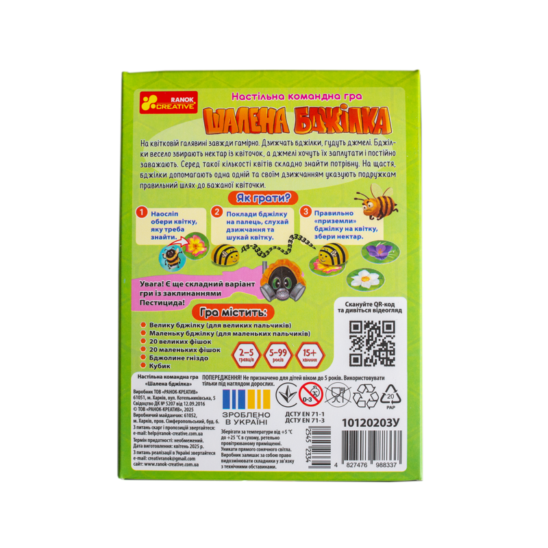 Якщо ви шукаєте захоплюючу гру, яка об’єднує гравців та дарує незабутні емоції, настільна гра Шалена бджілка стане чудовим вибором. Вона створена для дітей і дорослих віком від 5 до 99 років, та розрахована на 2–5 гравців. Тривалість однієї партії — всього 15 хвилин, але кожна гра дарує безліч сміху, руху та щирих емоцій.