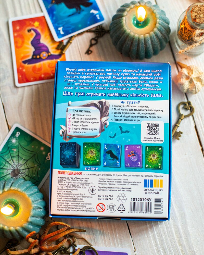 Настільна гра Чаклунство — це захопливе поєднання магії, передбачення та доброго гумору. Гра ідеально підходить для веселої компанії від 2 до 8 осіб. На вас чекає непередбачувана боротьба за перемогу, у якій знадобляться стратегія, інтуїція та трішки магічних здібностей.