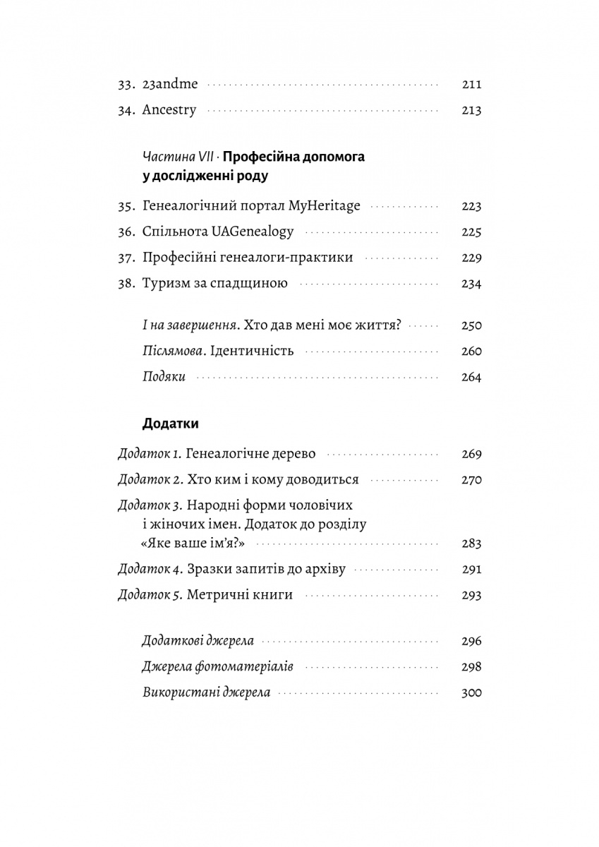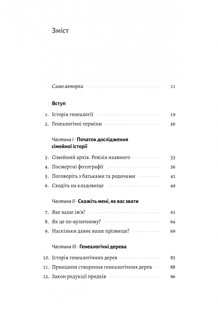 Авторка надає покрокову інструкцію, як скласти генеалогічне дерево, проаналізувати документи, вести сімейні записи, інтерпретувати сімейні легенди, а також інтегрувати ДНК-аналіз у дослідження.