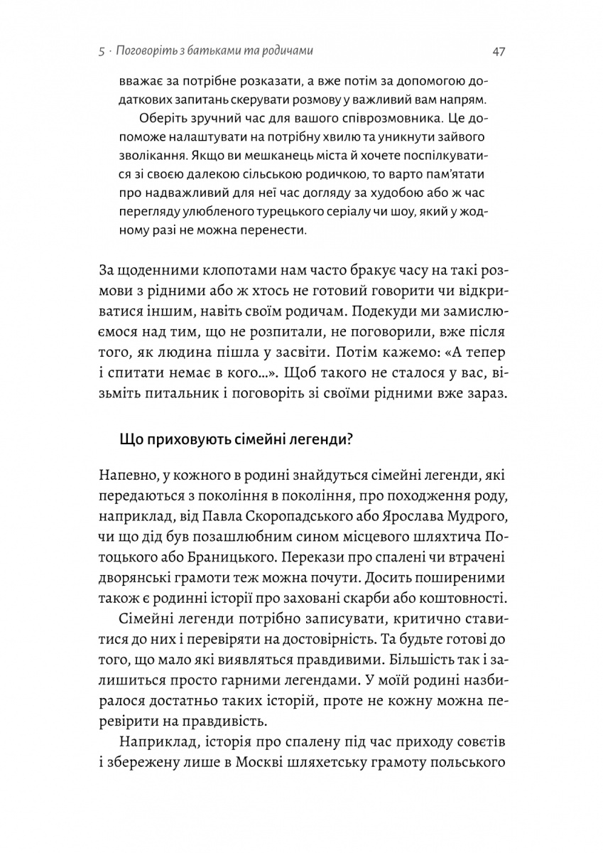 Не відкладайте — дізнайтесь більше про своє коріння вже сьогодні. Ця книжка змінить ваше уявлення про сімейну історію і дозволить відновити втрачені зв’язки між поколіннями.