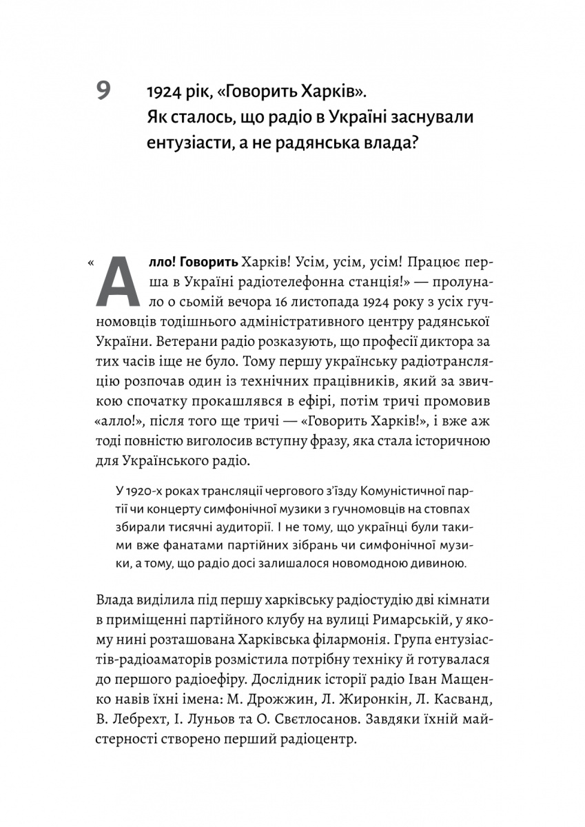 Це документальна розповідь про формування української ідентичності через радіохвилю. Читач дізнається про боротьбу з радянською цензурою, про появу української естради, відновлення мовлення в деокупованих містах під час війни та про внесок українських інженерів і журналістів у світове радіомовлення.