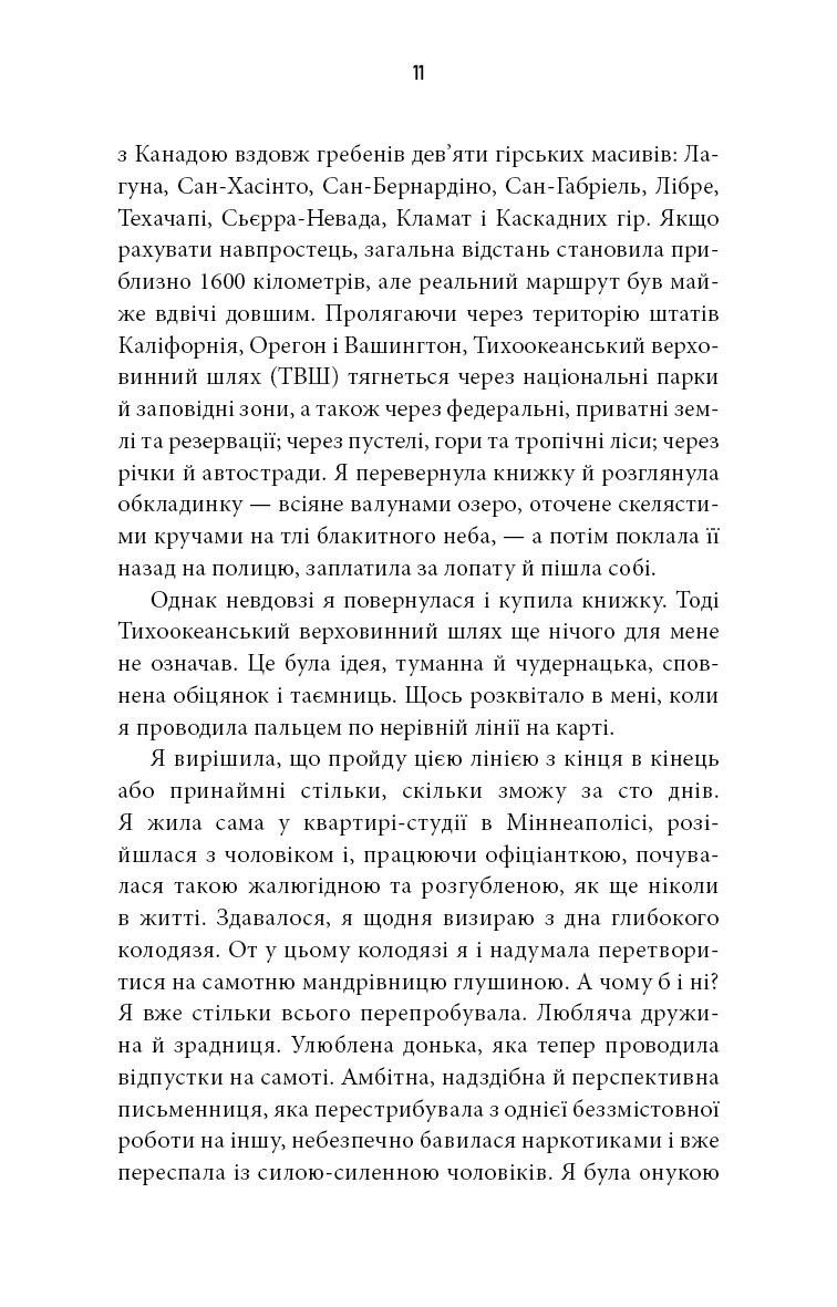 У двадцять два роки Шерил Стрейд думала, що втратила все. Після смерті матері її сім’я роз’їхалася, а власний шлюб незабаром був зруйнований. Через чотири роки, не маючи більше чого втрачати, вона прийняла найбільш імпульсивне рішення у своєму житті. Без найменшого досвіду, керуючись лише сліпою волею, вона пройшла понад тисячу миль стежкою Pacific Crest від пустелі Мохаве через Каліфорнію та Орегон до штату Вашингтон — і зробила це сама. Напружена, стильна, добра й дотепна, ця розповідь відверто передає жах і задоволення жінки, яка, незважаючи на всі труднощі, рухається вперед.