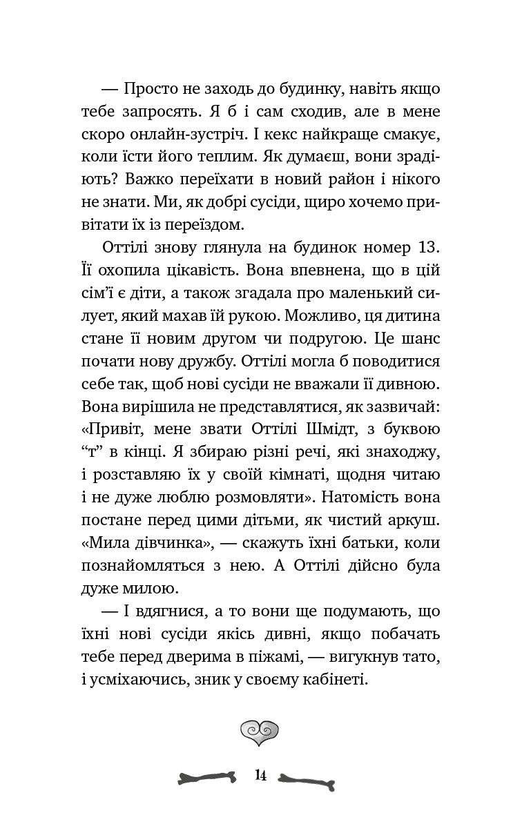 Дівчинка Оттілі у захваті — нарешті в сусідньому будинку з’являються нові мешканці! Але ця сім’я зовсім не така, як інші. Троє дітей, тато, мама, дідусь і дивний собака. Новий друг Му здається звичайним хлопчиком, якби не крихітні ріжки на голові. Його сестра Вольфі добре бачить у темряві, а їхня молодша сестричка Хуш й узагалі невидима. А дідусь — він лісовий дух, який не надто добре вживається серед людей. Та що ж робити, якщо твоя сім’я вирізняється настільки, що світ людей не готовий прийняти?