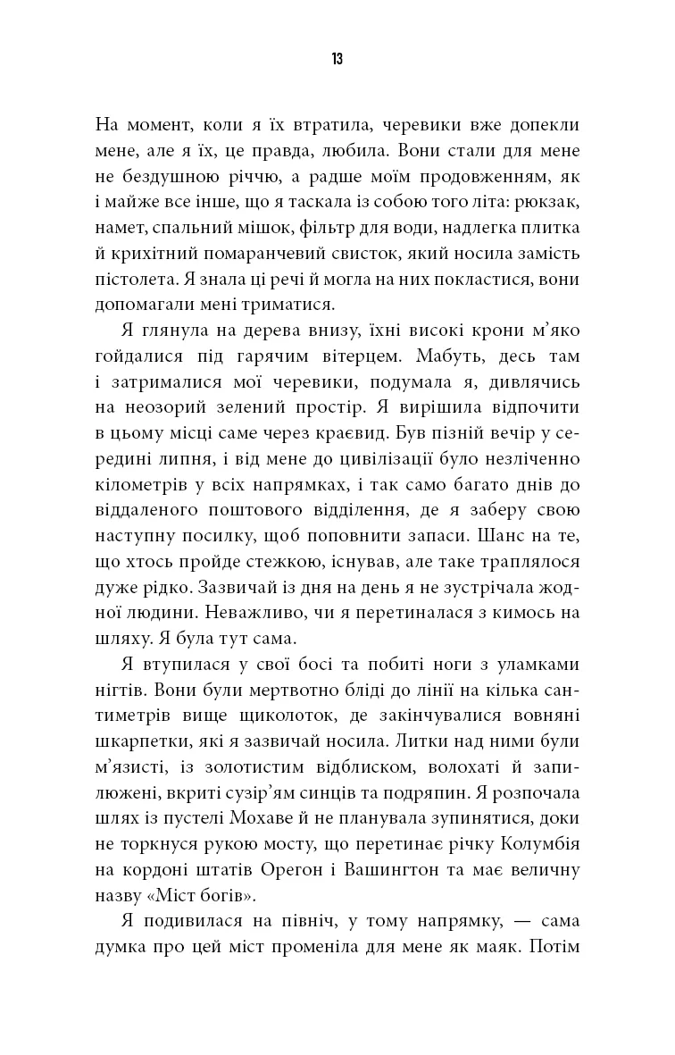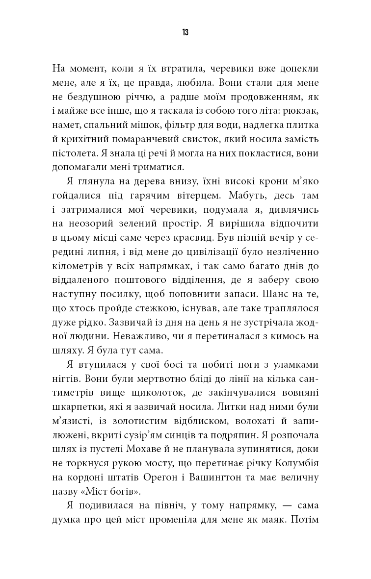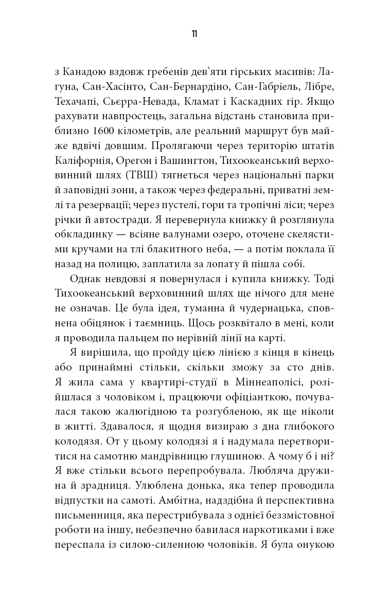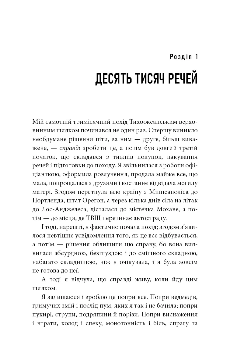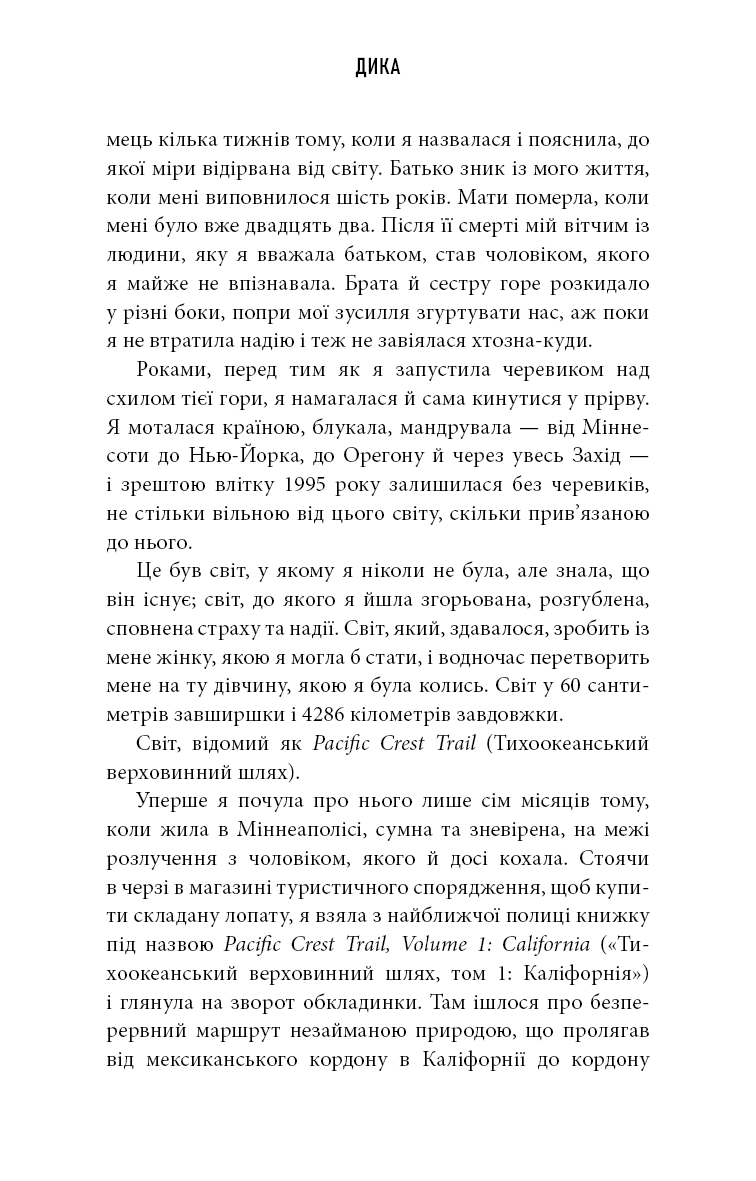 Після тяжкої утрати матері, розпаду родини та розлучення, Шерил у віці 26 років вирушає у складну одиночну подорож стежкою Pacific Crest Trail довжиною понад 1000 миль. Вона проходить через Мохавську пустелю, гористу Каліфорнію, зелені ліси Орегону до штату Вашингтон. Без спеціальної підготовки, одна, з мінімумом речей, авторка кидає виклик не лише природі, а й самій собі.
