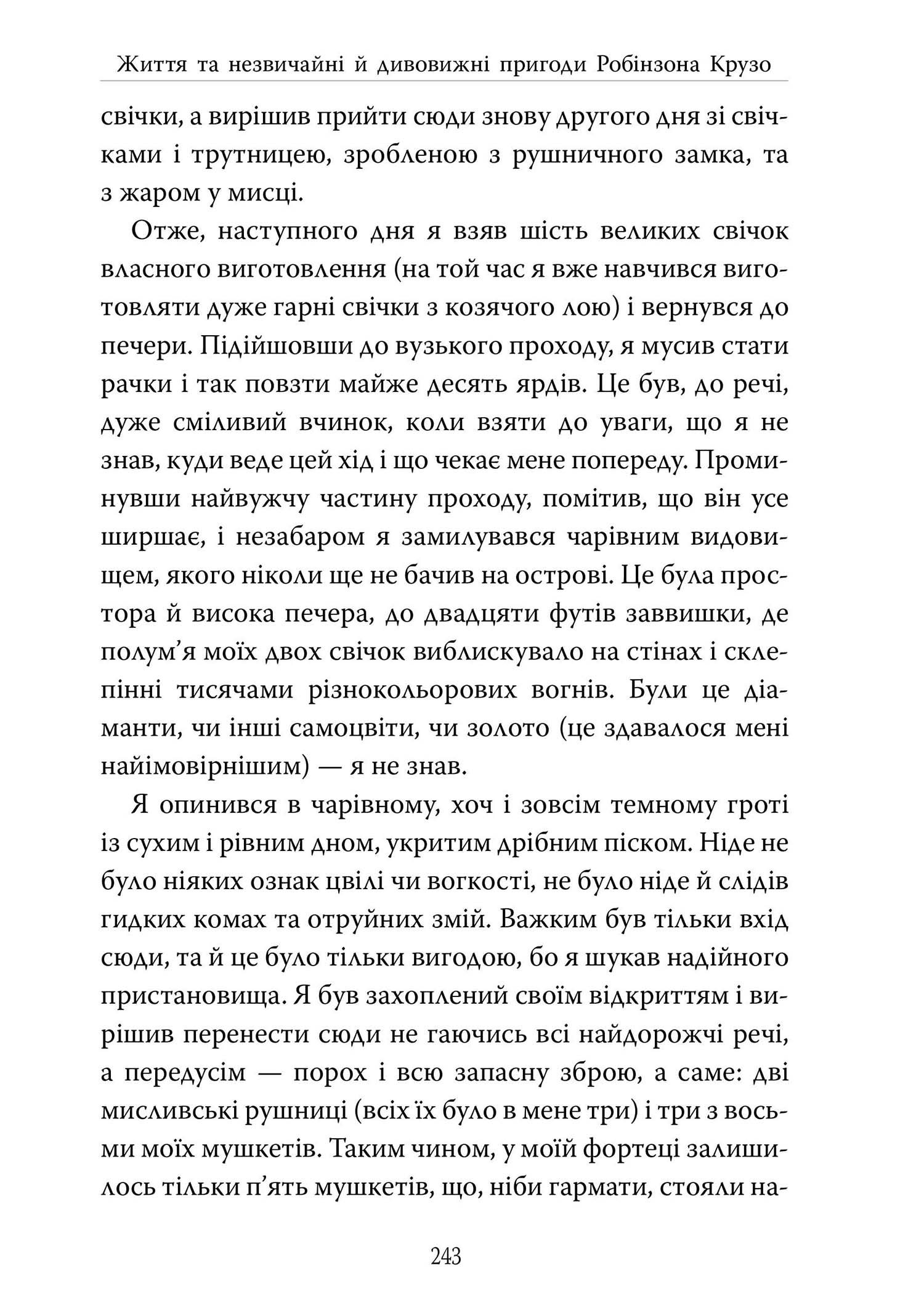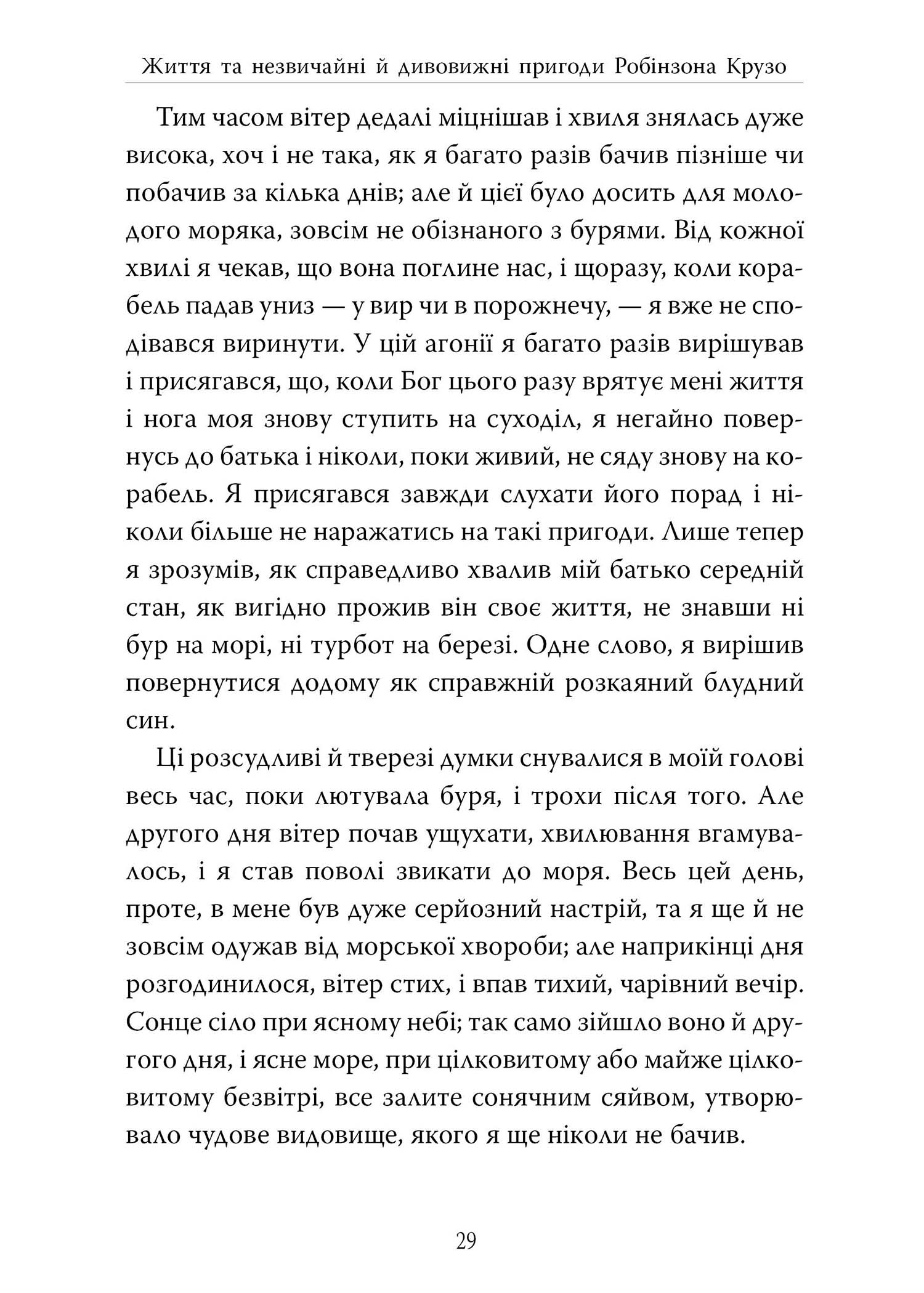 «Життя та незвичайні й дивовижні пригоди Робінзона Крузо» — роман, знайомий нам із самого дитинства. Історія про чоловіка, що прожив 28 років на безлюдному острові. Є тут і захопливі мандри, і підступні пірати, і жорстокі людожери… Романтика й екзотика. Прагнення вижити попри все. Перемогти бурхливу стихію, дику природу й самого себе. Та чи все так очевидно в цій історії? Чому «Робінзон Крузо» став першим європейським бестселером? Що це — пригодницький роман, сповідь героя, посібник для самовиховання, християнська проповідь, а чи хроніки, які мають документальну основу?