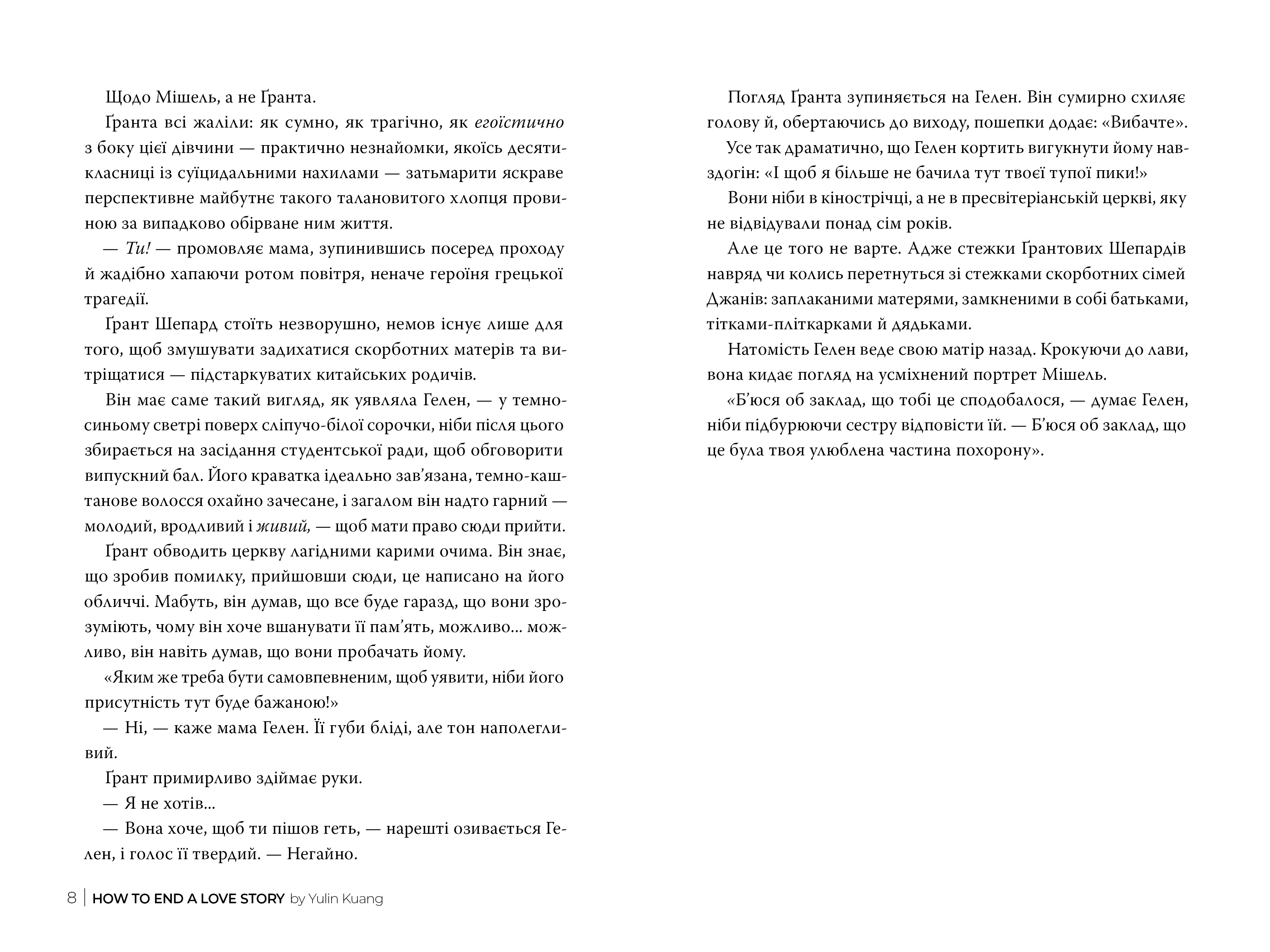 Книга Як завершити історію кохання авторки Юлінь Кван — це емоційна історія про зцілення, вибачення та новий початок. Після тринадцяти років мовчання колишні кохані, Гелен Джан та Ґрант Шепард, знову перетинають свої шляхи. Обох об'єднує не лише спільне минуле, а й спільний проєкт у Голлівуді.