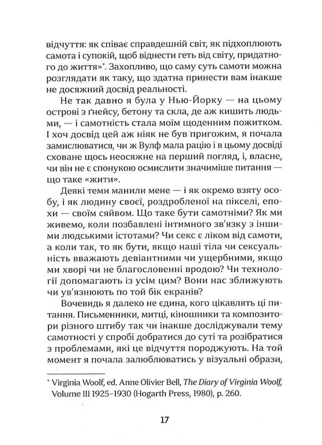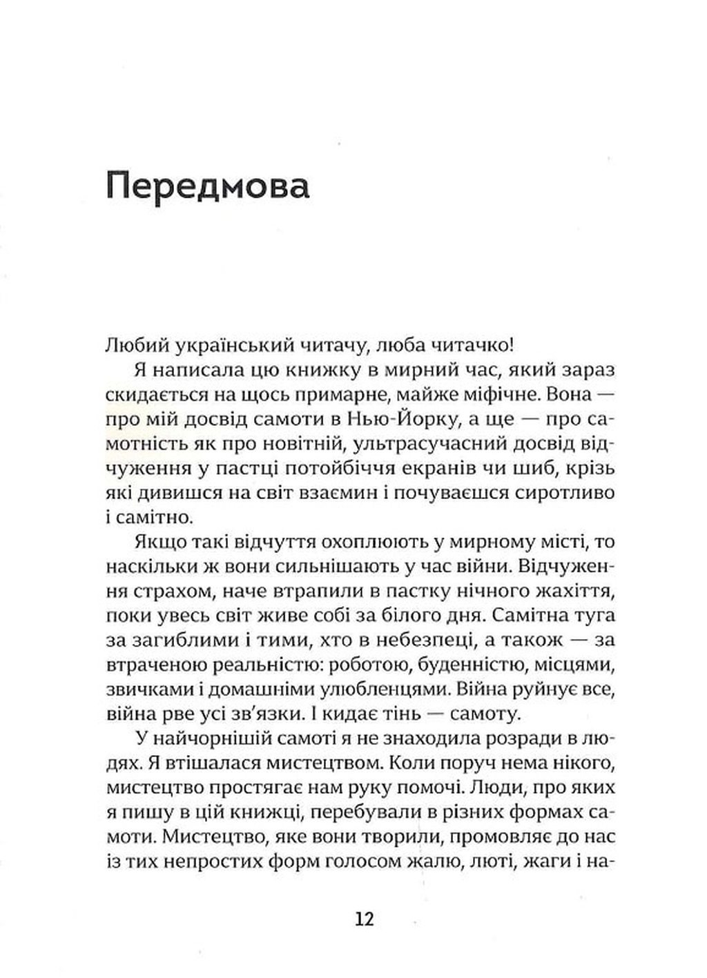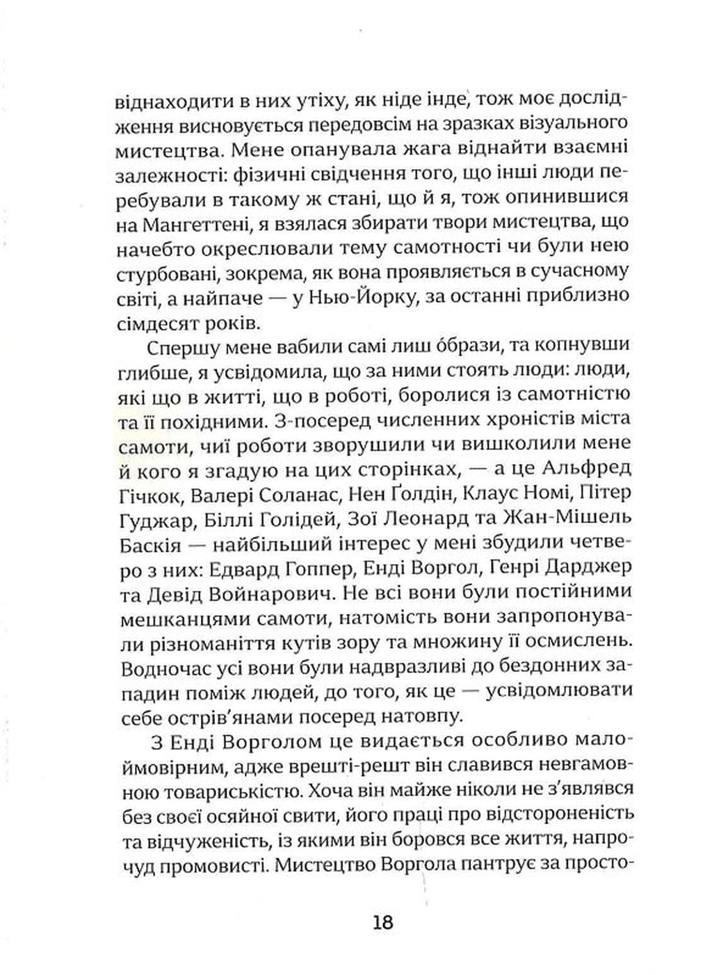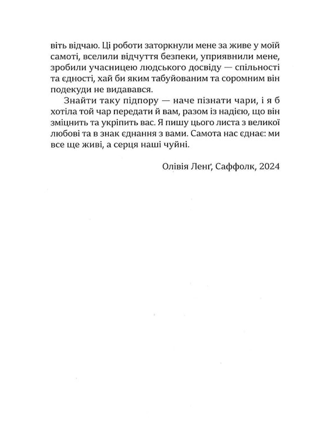 Коли авторка переїжджає до Нью-Йорка, її не полишає відчуття самотності, навіть попри щоденний контакт із мільйонами людей. Саме тоді вона починає шукати відповіді: як самотність проникає в життя та мистецтво і стає рушієм творчості.