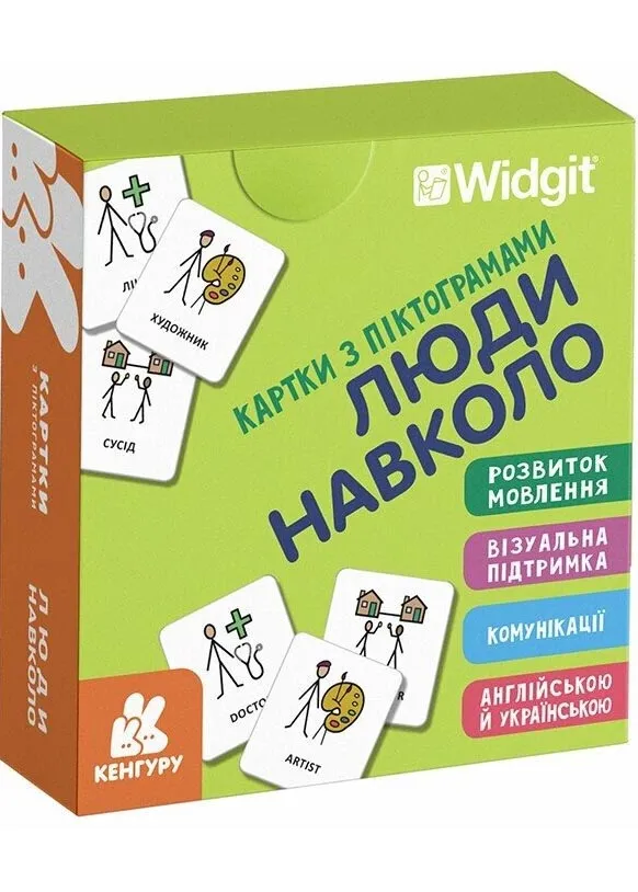 До комплекту входить набір тематичних карток на тему люди навколо: члени родини, професії, соціальні ролі. Кожна карта супроводжується візуальним образом — піктограмою й підписом, які допомагають краще розуміти сенс слова чи поняття.
