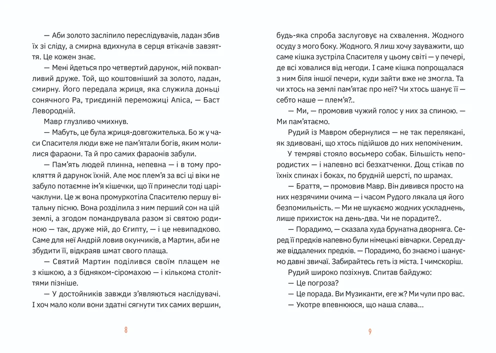 Головні герої книги — троє незвичайних мандрівників: повнявий рудий кіт, сліпий чорний ньюфаундленд і маленька сова, що майже ніколи не спить. Вони мандрують разом, хоч ніхто й не знає, чому саме. Їх називають Музикантами, але справжнє призначення цієї трійці розкривається на сторінках книги лише поступово.