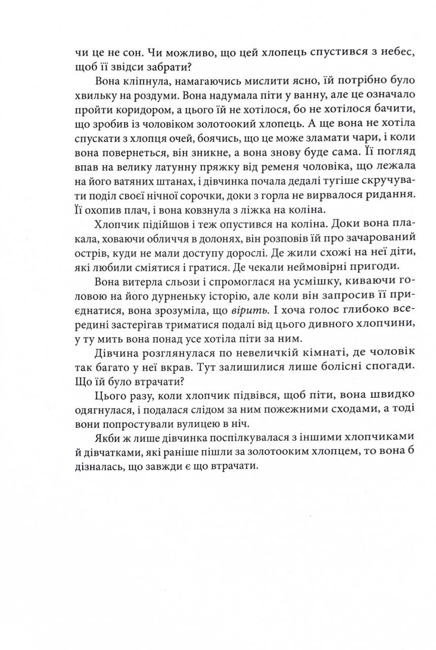 Пітер — харизматичний та небезпечний хлопець із золотистими очима. Його образ руйнує наші традиційні уявлення про веселого Пітера Пена. У книзі він постає як лідер групи загублених дітей, яких зібрав навколо себе у боротьбі за виживання. Його новим супутником стає чотирнадцятирічний Нік — хлопець із Нью-Йорка, якого врятовано з рук наркодилерів.