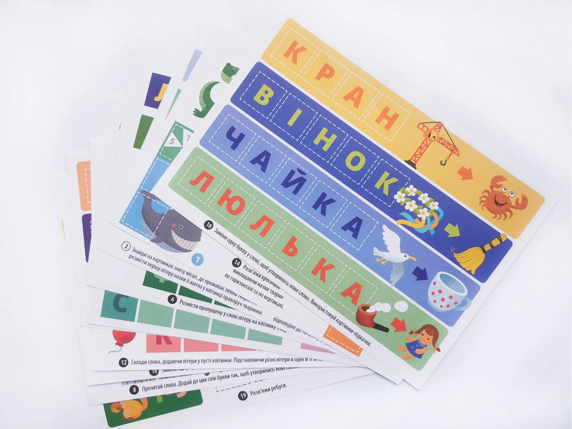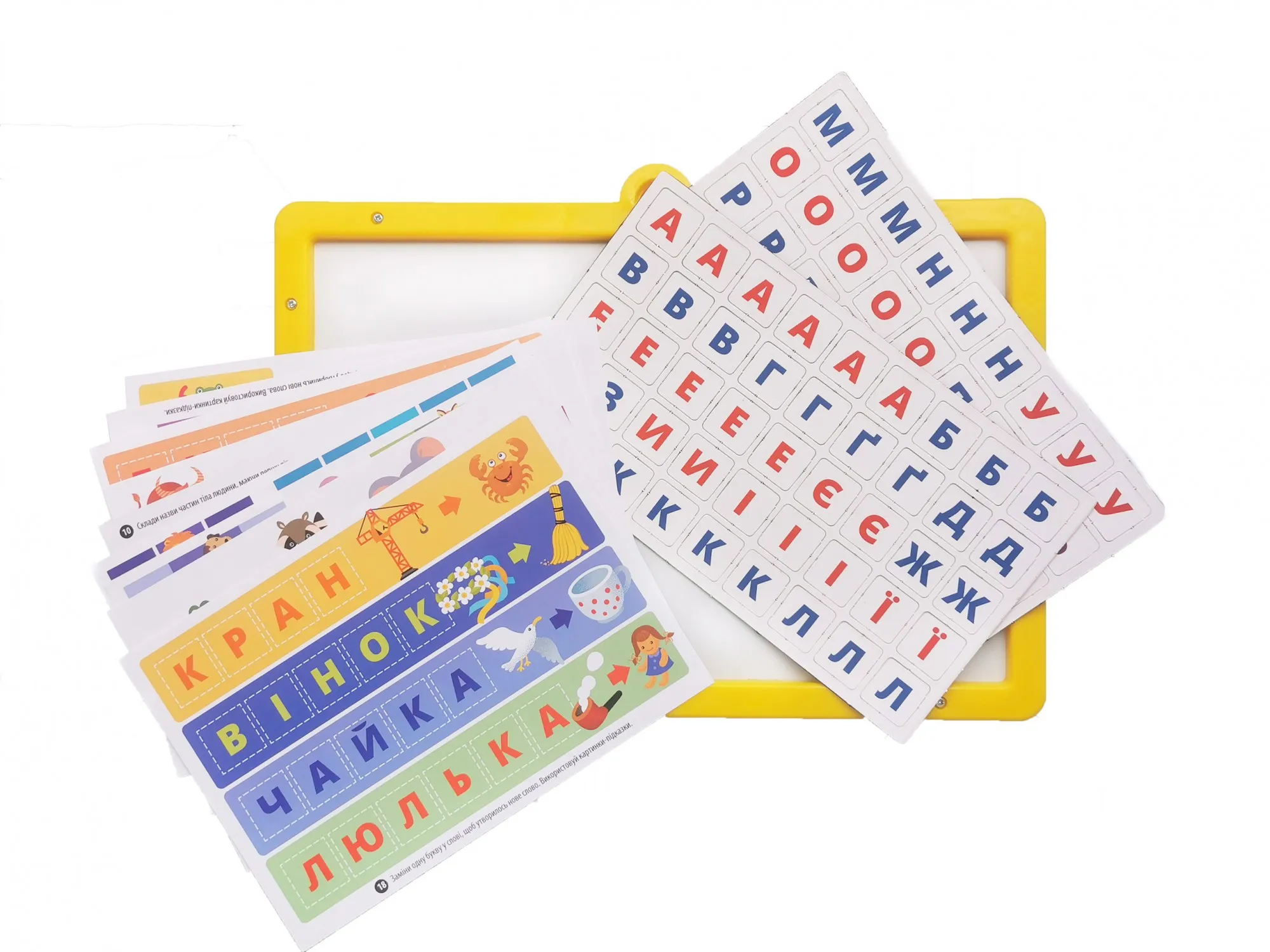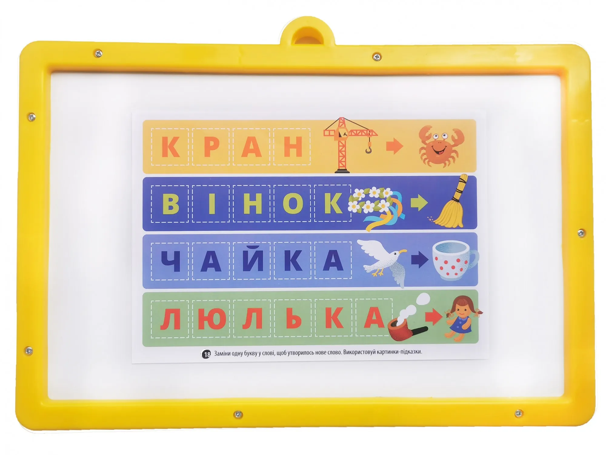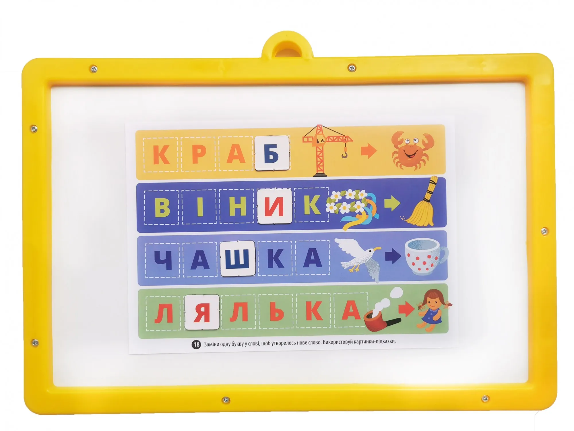 Ця гра містить 20 сторінок цікавих та різноманітних завдань, комплект магнітних букв та магнітну дошку, що допоможуть дитині:-вивчати букви, визначаючи першу букву знайомих предметів;-складати слова, користуючись підказками;-навчитись перетворювати одні слова на інші, змінивши одну чи декілька букв;-розв’язувати ребуси та кросворди.Склад: магнітна дошка 33х22 см, комплект магнітних букв, 20 сторінок завдань.Пакування: пакет 35х25 см.Від 5 років.