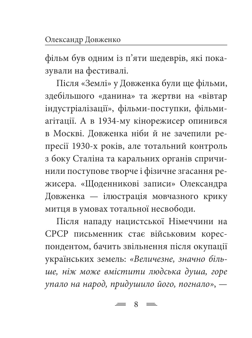 Олександр Довженко (1894–1956) – класик українського кіно, автор легендарного фільму Земля, відомий також як талановитий літератор. Його творча спадщина є важливою складовою української культури. Багато його робіт отримали визнання у світі, та в радянській державі він часто був у немилості через свою щирість, правдивість і активну громадянську позицію.